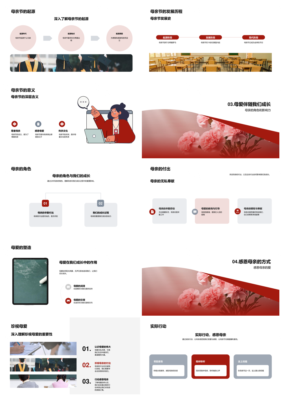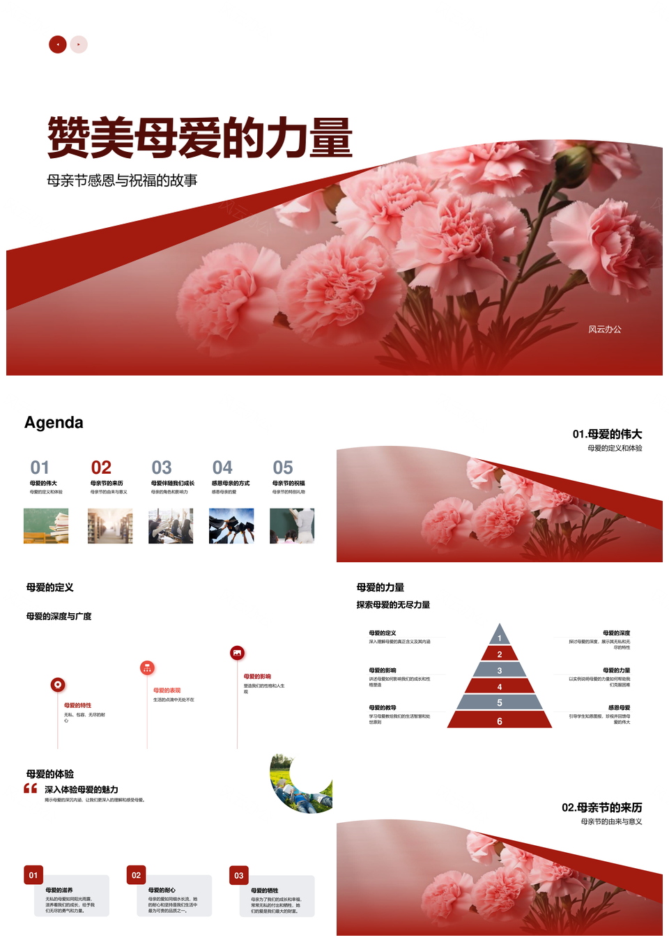 风云办公提供的母亲节礼赞母爱力量感恩康乃馨PPT模板,下载格式为pptx,一共23页,作品中文字及图均可以修改和编辑,图片更改请在作品中右键图片并更换,文字修改请直接点击文字进行修改。