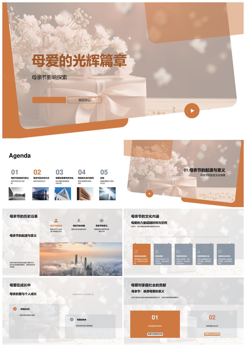 风云办公提供的母爱光辉母亲节历史家庭花束庆祝演讲PPT模板,下载格式为pptx,一共28页,作品中文字及图均可以修改和编辑,图片更改请在作品中右键图片并更换,文字修改请直接点击文字进行修改。