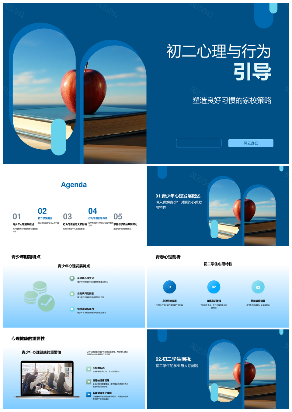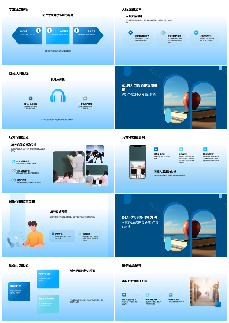 风云办公提供的初二家校策略引导学业人际行为习惯PPT模板,下载格式为pptx,一共24页,作品中文字及图均可以修改和编辑,图片更改请在作品中右键图片并更换,文字修改请直接点击文字进行修改。