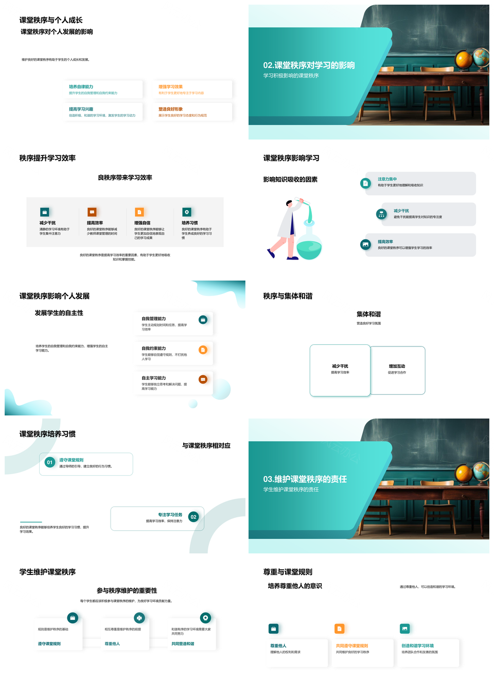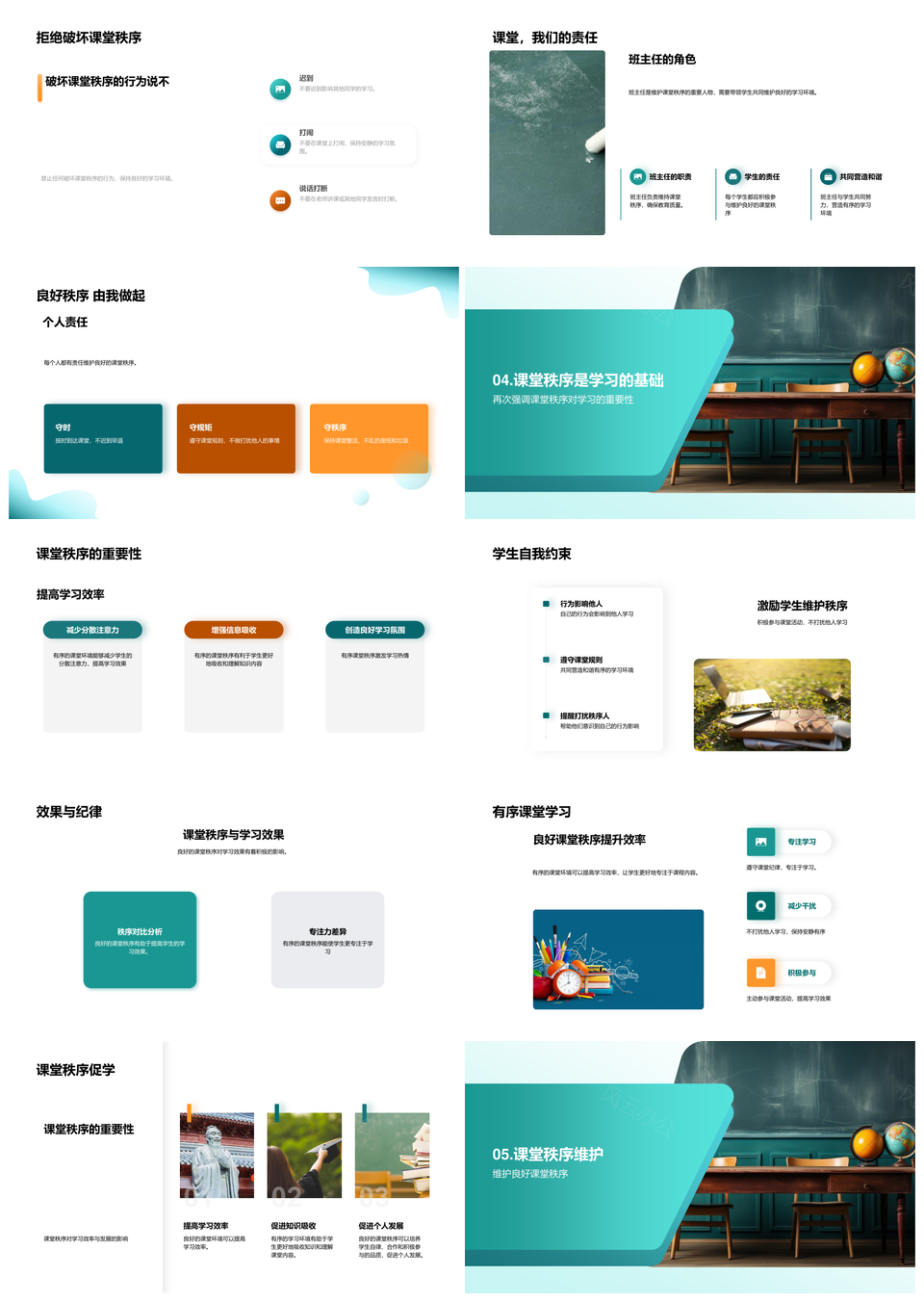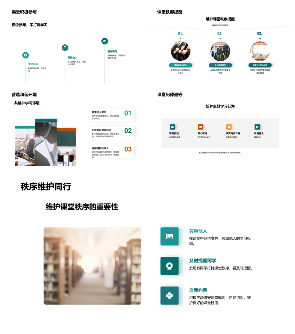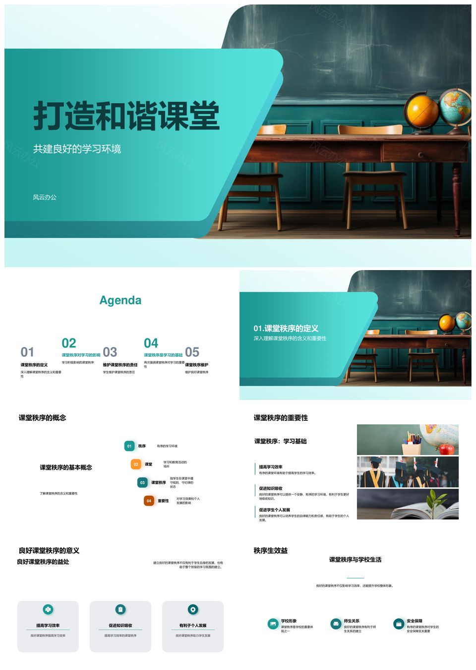风云办公提供的和谐课堂秩序与桌椅规范管理PPT模板,下载格式为pptx,一共33页,作品中文字及图均可以修改和编辑,图片更改请在作品中右键图片并更换,文字修改请直接点击文字进行修改。