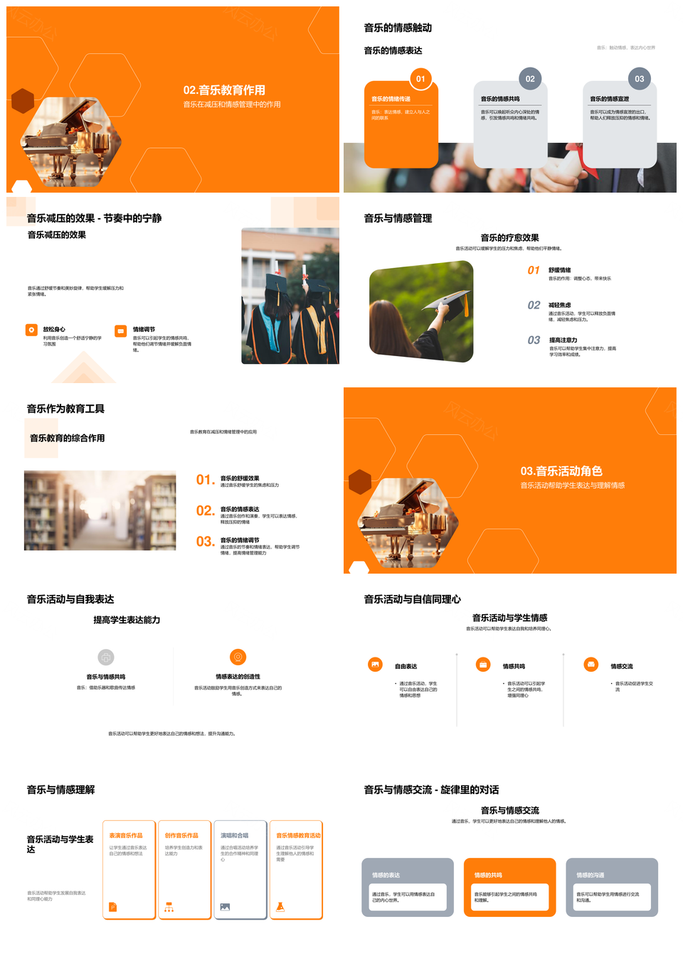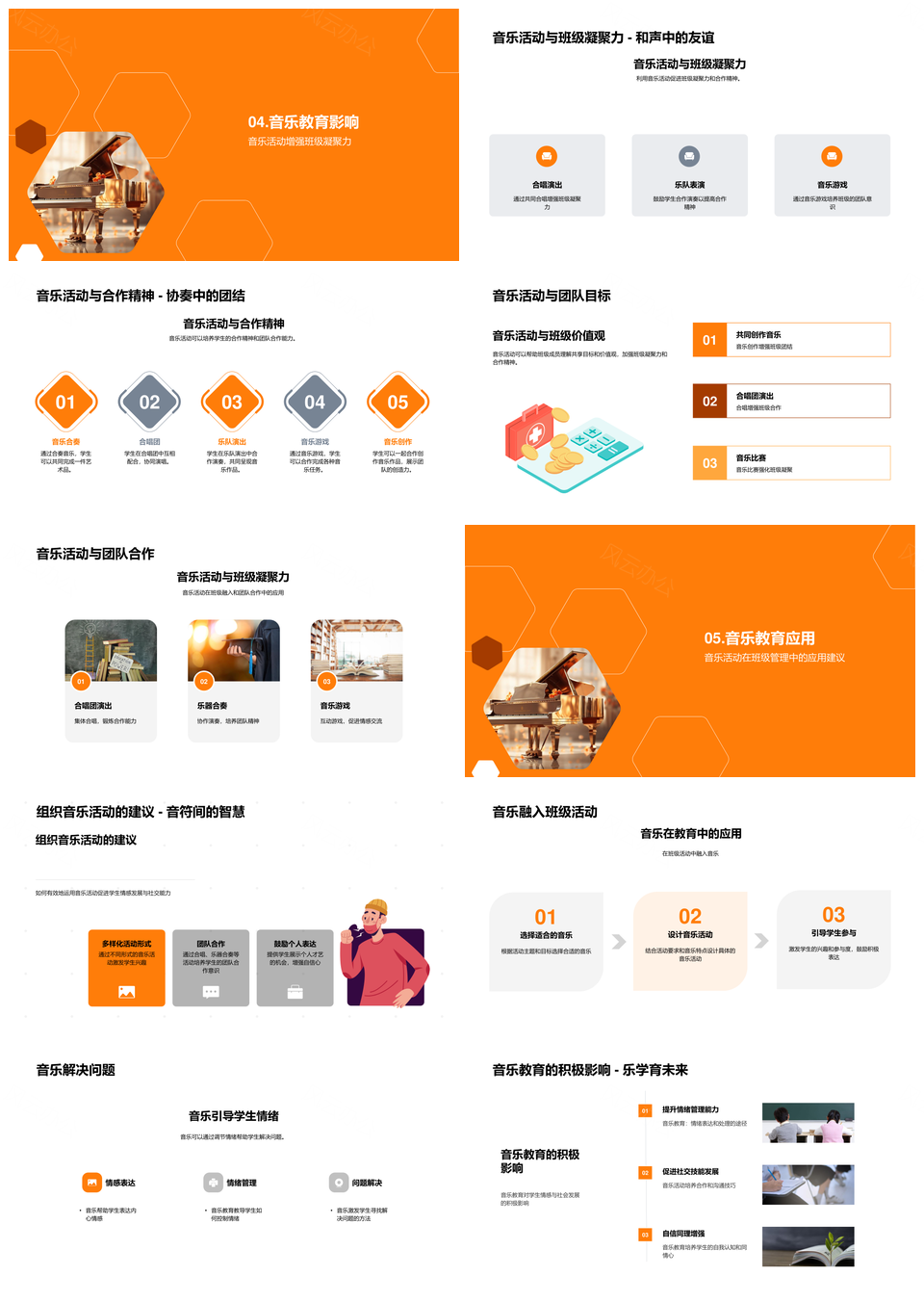 这款PPT模板以音乐与教育的融合为核心,聚焦青少年情感成长与社交议题。设计采用温暖的橙色为主调,辅以流动的音符符号与渐变光束元素,传递活力与希望感。学术场景中融入了波粒二象性概念底纹,配合激光动态效果,隐喻艺术与科学的双重启发价值。模块涵盖情感心理学图示、社交行为数据模型等专业内容,适用于音乐教育讲座、青少年成长研究汇报等多类场景。模板通过分阶式内容架构,确保复杂理论的可视化呈现,兼具学科深度与视觉舒适度,帮助教育者更清晰地展示音乐对青少年认知发展与社交联结的积极影响。