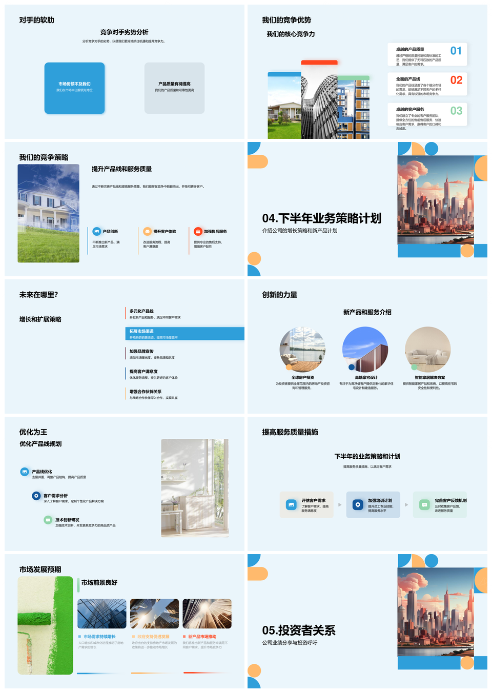 这是一张房地产市场趋势业绩竞争策略新产品政策摩天大楼投资者PPT模板,包含房地产市场、趋势、业绩、竞争策略、新产品、政策、摩天大楼、投资者等主题内容,也可用作房地产市场趋势业绩竞争策略、趋势业绩竞争策略新产品、业绩竞争策略新产品政策、竞争策略新产品政策摩天大楼、新产品政策摩天大楼投资者、房地产市场趋势业绩、趋势业绩竞争策略、业绩竞争策略新产品、竞争策略新产品政策、新产品政策摩天大楼、政策摩天大楼投资者、房地产市场趋势、趋势业绩、业绩竞争策略、竞争策略新产品等PPT场景使用。 风云办公提供的房地产市场趋势业绩竞争策略新产品政策摩天大楼投资者PPT模板,下载格式为pptx,一共33页,作品中文字及图均可以修改和编辑,图片更改请在作品中右键图片并更换,文字修改请直接点击文字进行修改。