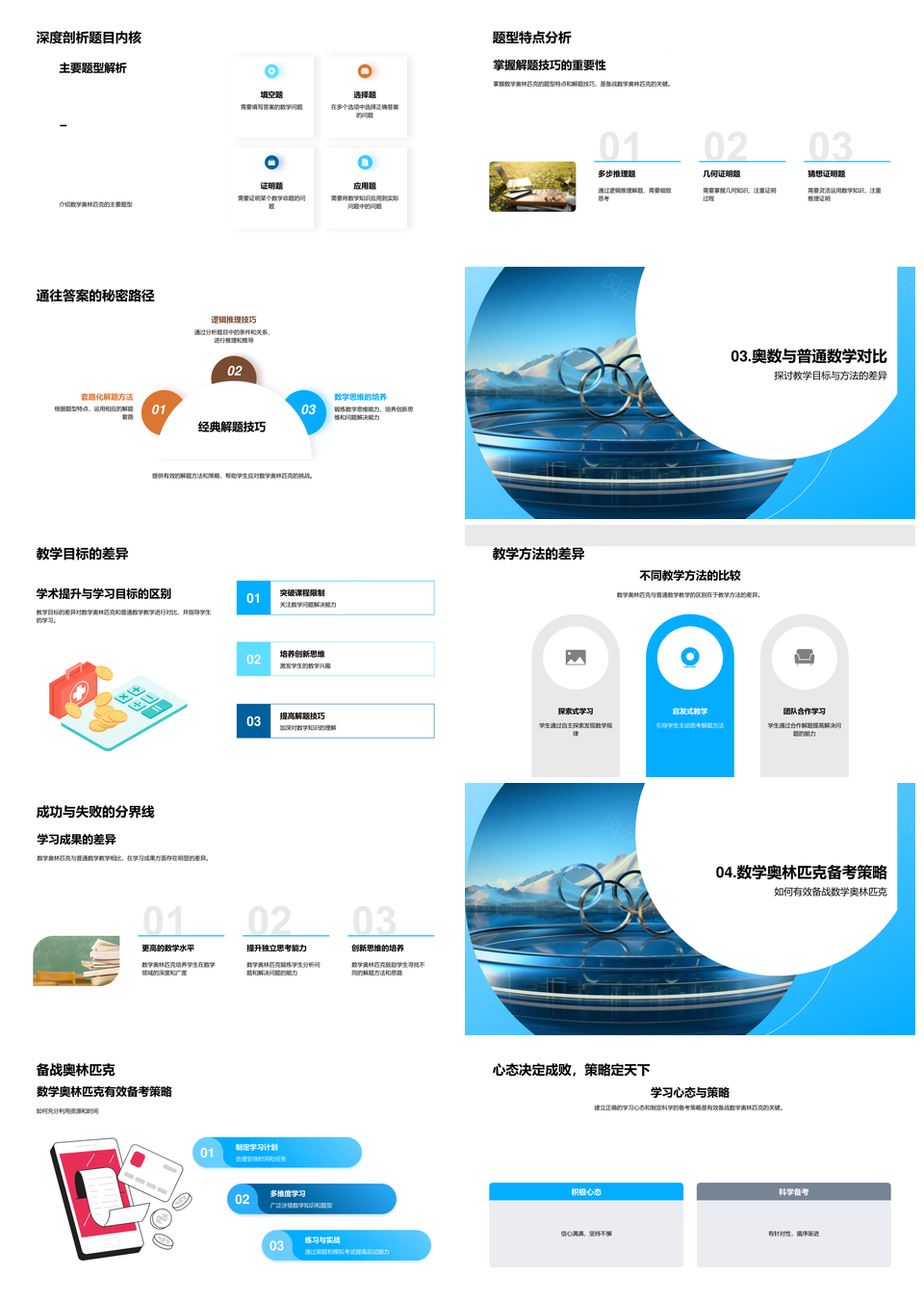 风云办公提供的数学奥赛解题备考策略与素养思维PPT模板,下载格式为pptx,一共23页,作品中文字及图均可以修改和编辑,图片更改请在作品中右键图片并更换,文字修改请直接点击文字进行修改。