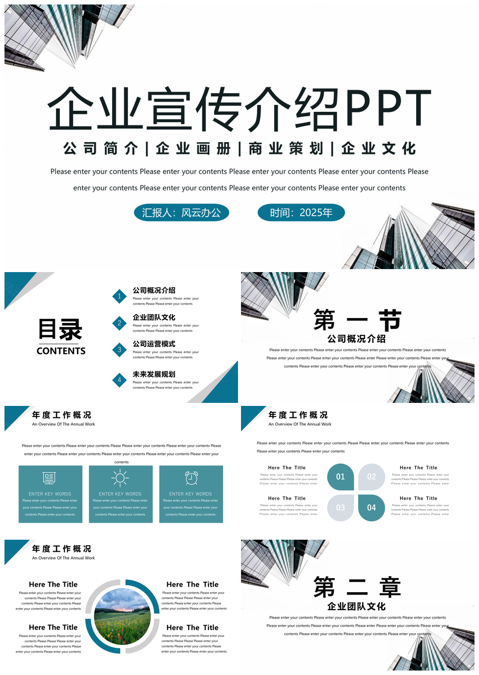 风云办公提供的2025简约大气企业宣传介绍PPT模板,下载格式为pptx,一共15页,作品中文字及图均可以修改和编辑,图片更改请在作品中右键图片并更换,文字修改请直接点击文字进行修改。