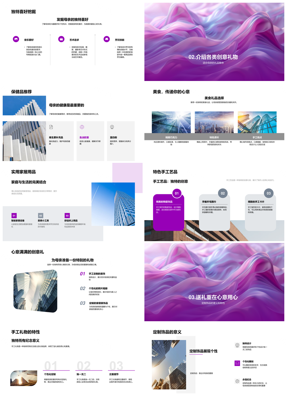 这是一张母亲节贴心礼物推荐按需选健康饰品手工艺品PPT模板,包含母亲节、贴心礼物、推荐、按需、健康饰品、手工艺品等主题内容,也可用作母亲节贴心礼物推荐按需选、母亲节贴心礼物推荐、母亲节礼物推荐按需选、贴心礼物推荐按需选、按需选健康饰品手工艺品、健康饰品手工艺品推荐、母亲节贴心礼物推荐、贴心礼物推荐健康、健康饰品手工艺品、母亲节健康饰品推荐、礼物推荐按需选、按需选健康饰品、手工艺品推荐、母亲节贴心礼物、健康饰品推荐等PPT场景使用。 风云办公提供的母亲节贴心礼物推荐按需选健康饰品手工艺品PPT模板,下载格式为pptx,一共33页,作品中文字及图均可以修改和编辑,图片更改请在作品中右键图片并更换,文字修改请直接点击文字进行修改。