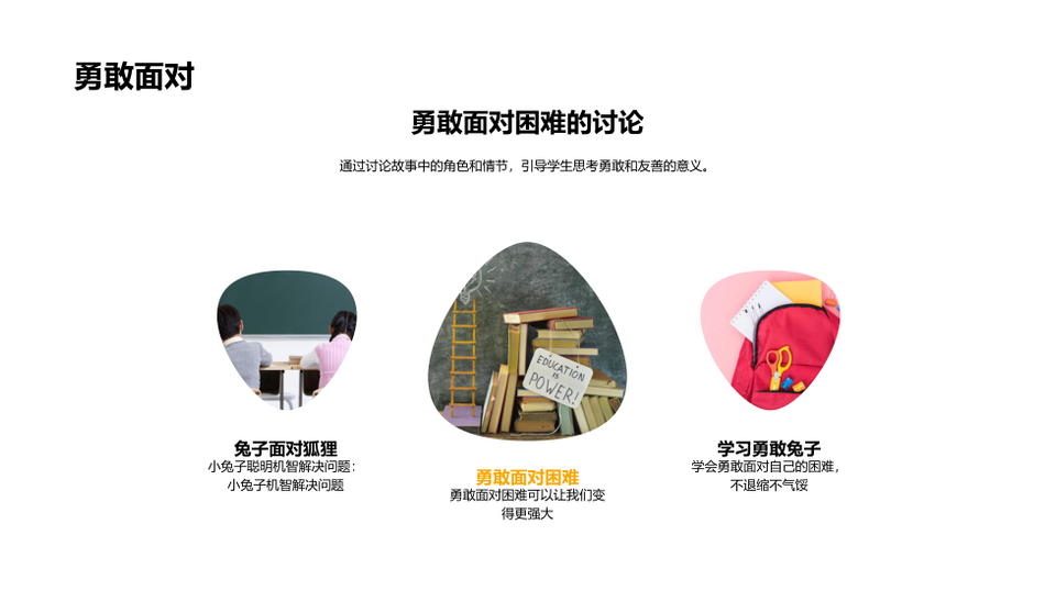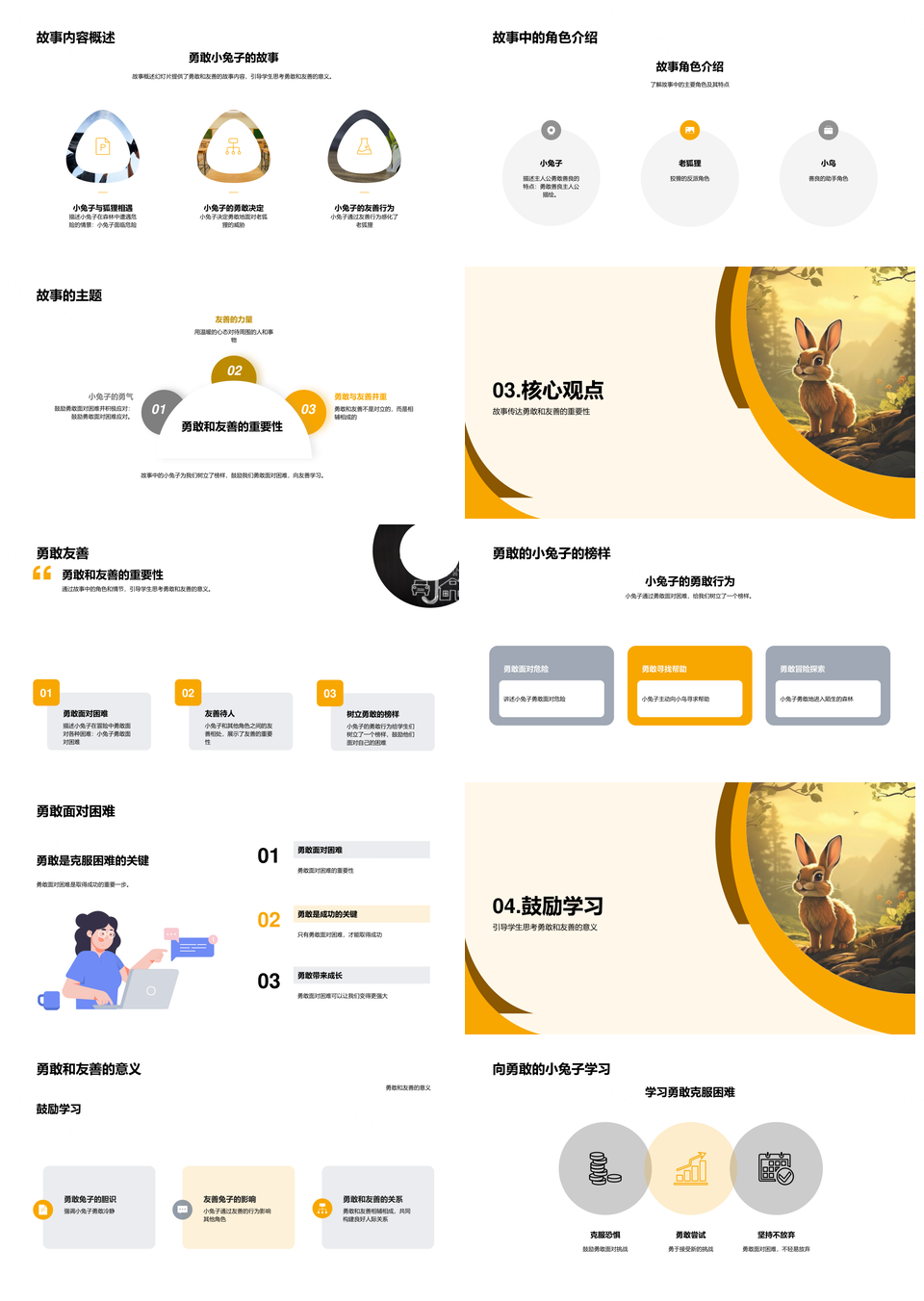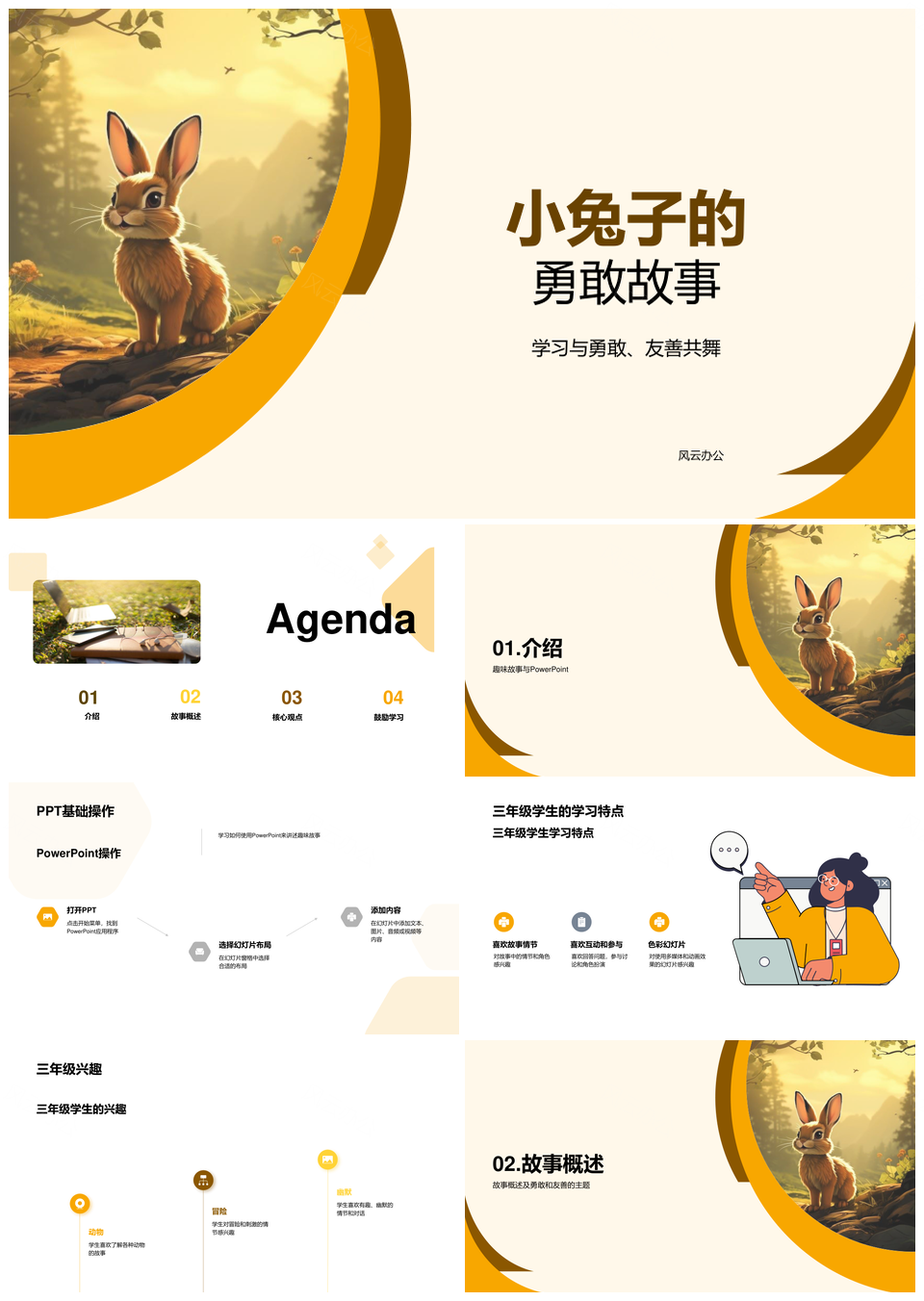 这是一张三年级趣味故事课勇敢小兔冒险培训师讲解PPT模板,包含三年级、趣味、故事课、勇敢小兔、冒险、培训师、讲解等主题内容,也可用作三年级趣味故事课勇敢、趣味故事课勇敢小兔、故事课勇敢小兔冒险、勇敢小兔冒险培训师、小兔冒险培训师讲解、三年级趣味故事课、趣味故事课勇敢、故事课勇敢小兔、勇敢小兔冒险、小兔冒险培训师、冒险培训师讲解、三年级趣味、趣味故事课、故事课勇敢、勇敢小兔等PPT场景使用。 风云办公提供的三年级趣味故事课勇敢小兔冒险培训师讲解PPT模板,下载格式为pptx,一共19页,作品中文字及图均可以修改和编辑,图片更改请在作品中右键图片并更换,文字修改请直接点击文字进行修改。
