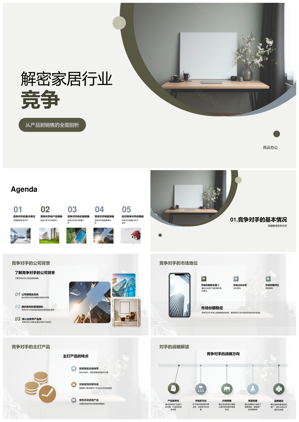 风云办公提供的家居行业竞争策略产品设计市场分析PPT模板,下载格式为pptx,一共33页,作品中文字及图均可以修改和编辑,图片更改请在作品中右键图片并更换,文字修改请直接点击文字进行修改。