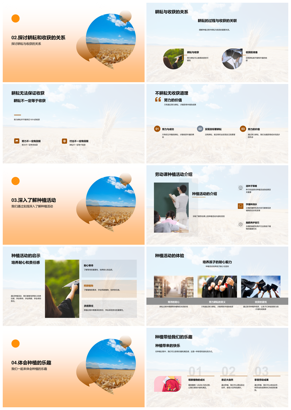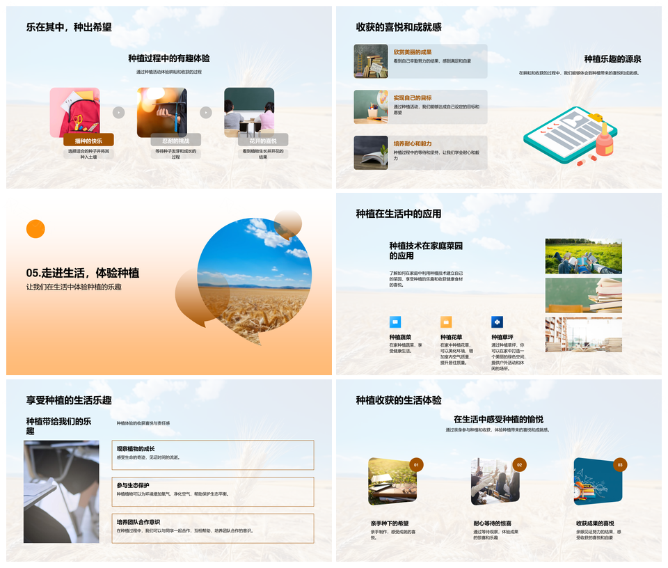 这是一张耕耘选种备土犁地生命教育种植收获PPT模板,包含耕耘、选种、备土、犁地、生命教育、种植、收获等主题内容,也可用作耕耘选种备土犁地、生命教育种植收获、备土犁地选种种植、选种备土犁地耕耘、犁地耕耘选种种植、耕耘选种备土、备土犁地选种、犁地选种种植、生命教育种植、教育种植收获、耕耘选种、选种备土、备土犁地、犁地选种、选种种植等PPT场景使用。
