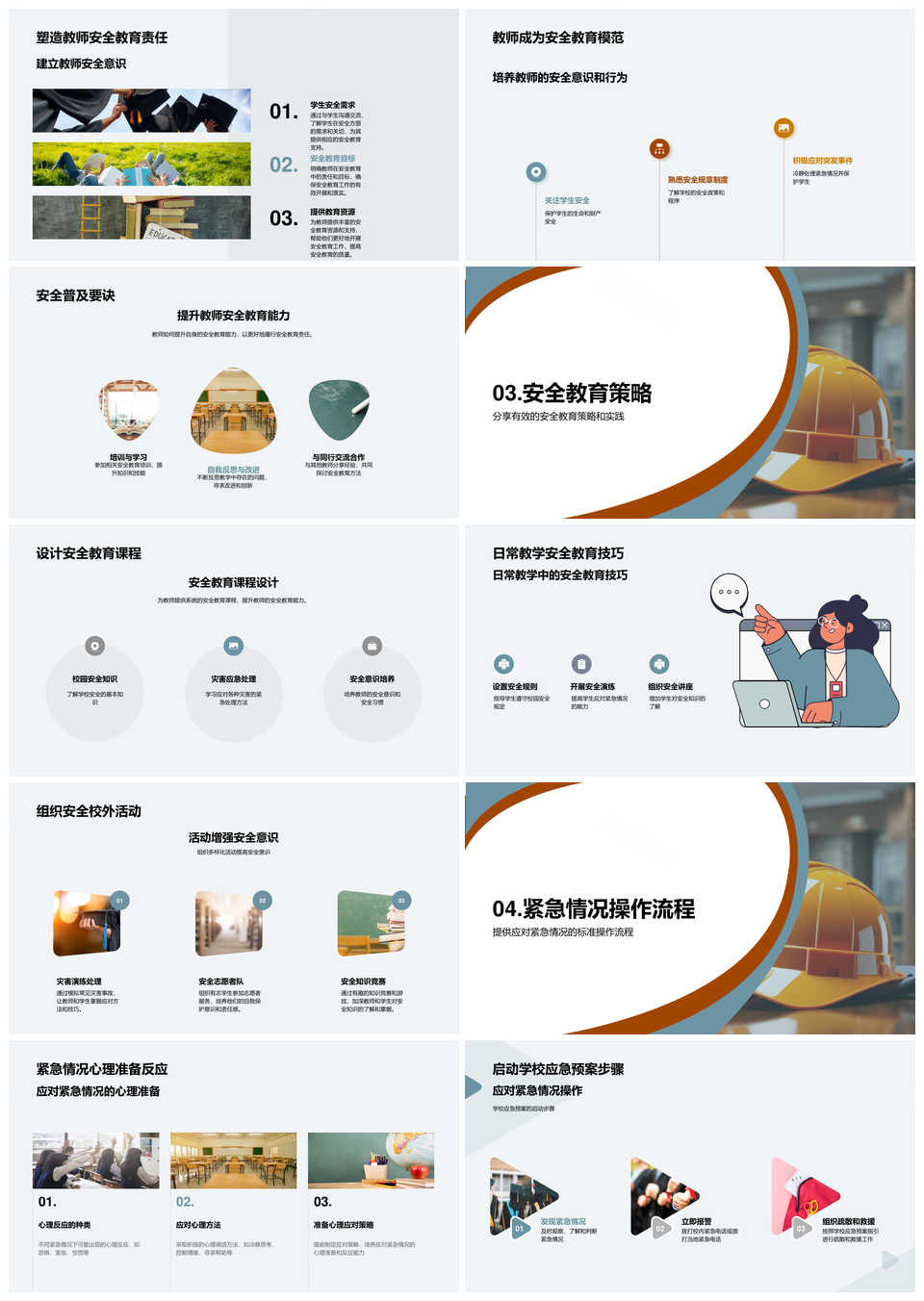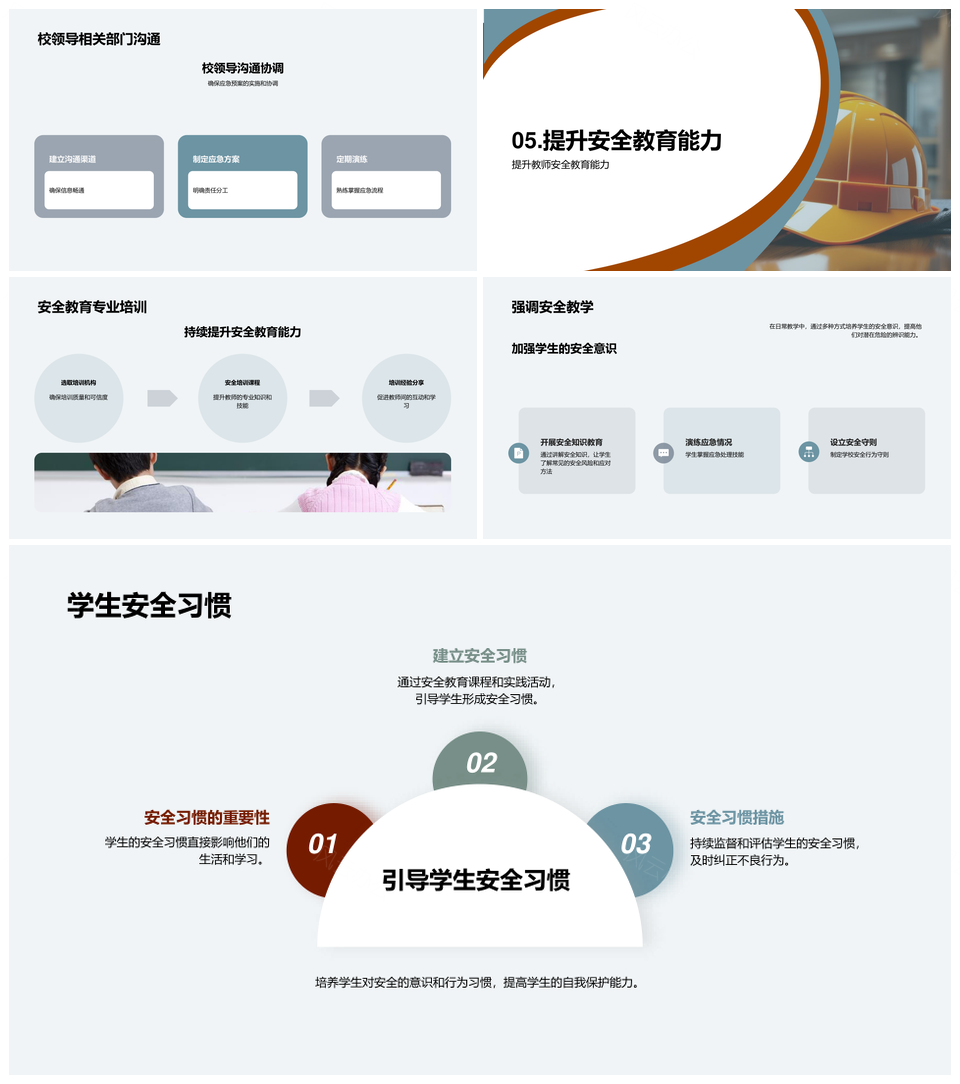 这是一张强化师生安全教育培训筑牢校园应急安全体系PPT模板,包含师生、安全教育培训、校园、应急安全体系等主题内容,也可用作强化师生安全教育培训、筑牢校园应急安全体系、强化师生安全教育、师生安全教育培训、安全教育培训筑牢、培训筑牢校园、筑牢校园应急安全、校园应急安全体系、强化师生、师生安全教育、安全教育培训、培训筑牢、筑牢校园、校园应急安全、应急安全体系等PPT场景使用。 风云办公提供的强化师生安全教育培训筑牢校园应急安全体系PPT模板,下载格式为pptx,一共23页,作品中文字及图均可以修改和编辑,图片更改请在作品中右键图片并更换,文字修改请直接点击文字进行修改。
