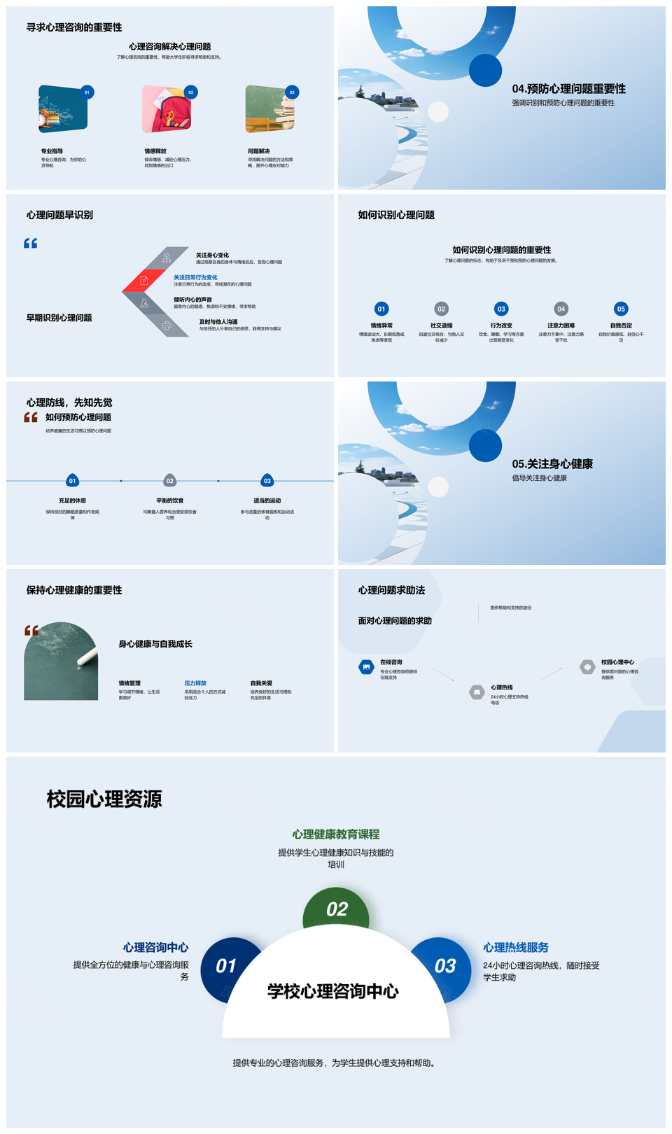 这是一张大学生心理健康问题识别预防与学业人际应对PPT模板,包含大学生、心理健康问题、识别、预防、学业、人际、应对等主题内容,也可用作大学生心理健康问题识别、心理健康问题识别预防、问题识别预防学业、识别预防学业人际、预防学业人际应对、大学生心理健康问题、心理健康问题识别、问题识别预防、识别预防学业、预防学业人际、学业人际应对、大学生心理健康、心理健康问题、问题识别、识别预防等PPT场景使用。 风云办公提供的大学生心理健康问题识别预防与学业人际应对PPT模板,下载格式为pptx,一共27页,作品中文字及图均可以修改和编辑,图片更改请在作品中右键图片并更换,文字修改请直接点击文字进行修改。