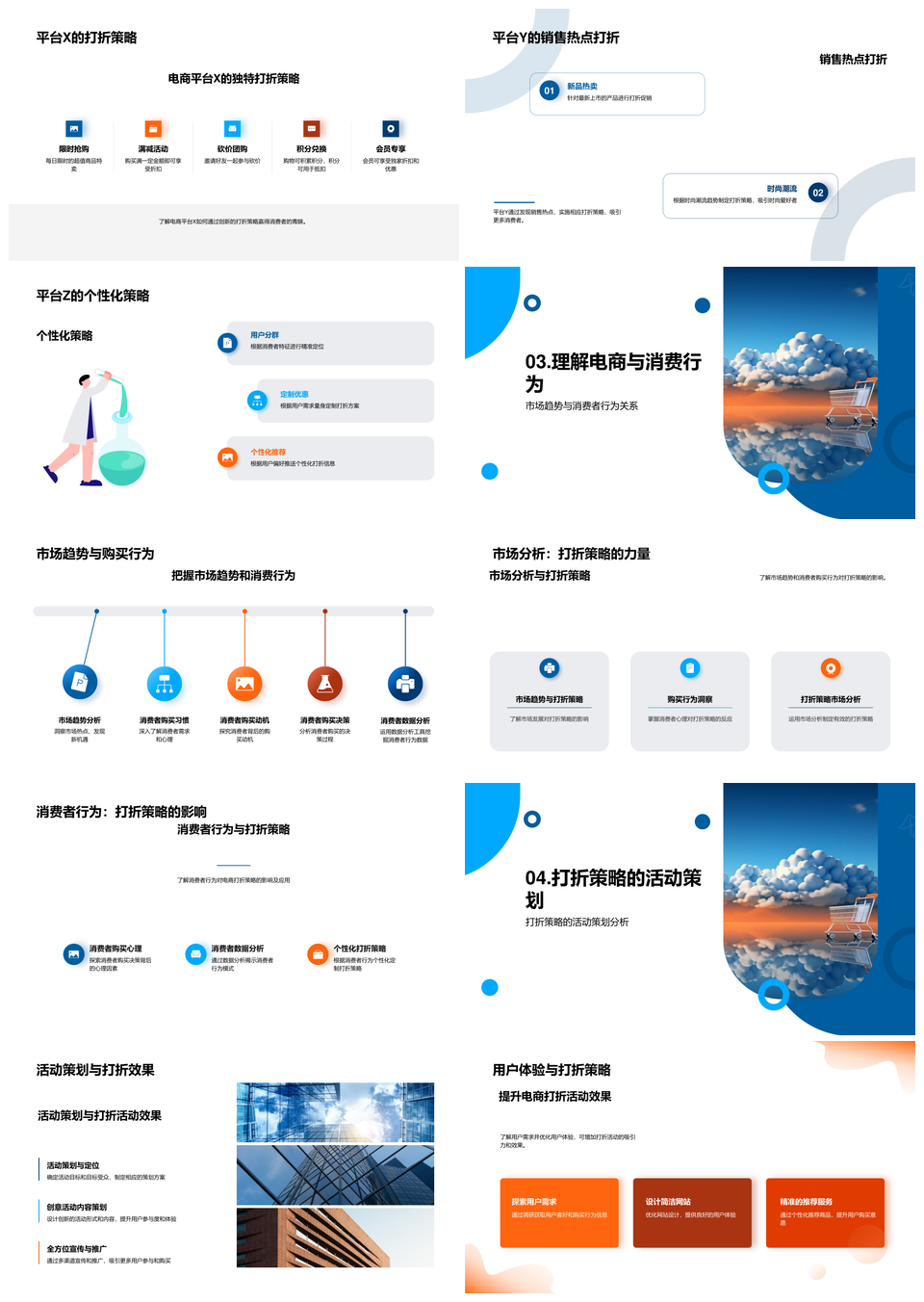 这是一张电商折扣新战略洞察消费者行为优化体验趋势PPT模板,包含电商、折扣、新战略、洞察、消费者、行为、优化、体验、趋势等主题内容,也可用作电商折扣新战略洞察、折扣新战略洞察消费者行为、新战略洞察消费者行为优化、洞察消费者行为优化体验、消费者行为优化体验趋势、电商折扣新战略、折扣新战略洞察、新战略洞察消费者行为、洞察消费者行为优化、消费者行为优化体验、优化体验趋势、电商折扣、折扣新战略、新战略洞察、洞察消费者行为等PPT场景使用。 风云办公提供的电商折扣新战略洞察消费者行为优化体验趋势PPT模板,下载格式为pptx,一共23页,作品中文字及图均可以修改和编辑,图片更改请在作品中右键图片并更换,文字修改请直接点击文字进行修改。