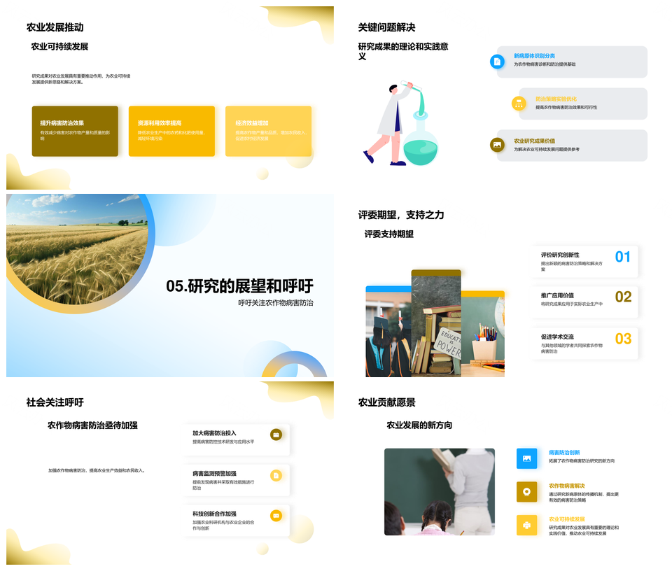 这款农作物病害主题PPT模板以科学视角融合实用设计,主视觉采用蓝色与黄色碰撞,传递科技严谨与病害预警的双重含义;环形图表与波点元素贯穿始终,模拟病原微观形态及激光检测的动态轨迹。内容页通过分形圆层结构呈现病理分析流程,辅以光粒子抽象纹理呼应波粒二象性的研究思维,逻辑框架可自由延展实验数据与防治方案。适用于植保科研汇报、农业技术培训等场景,模块化排版确保复杂信息的可视化呈现,帮助学者精准传递病害防控的专业价值。