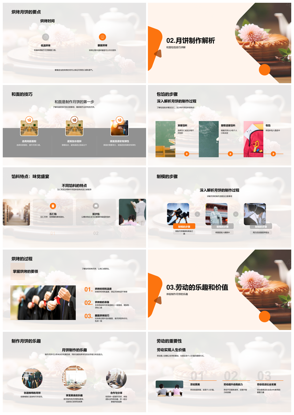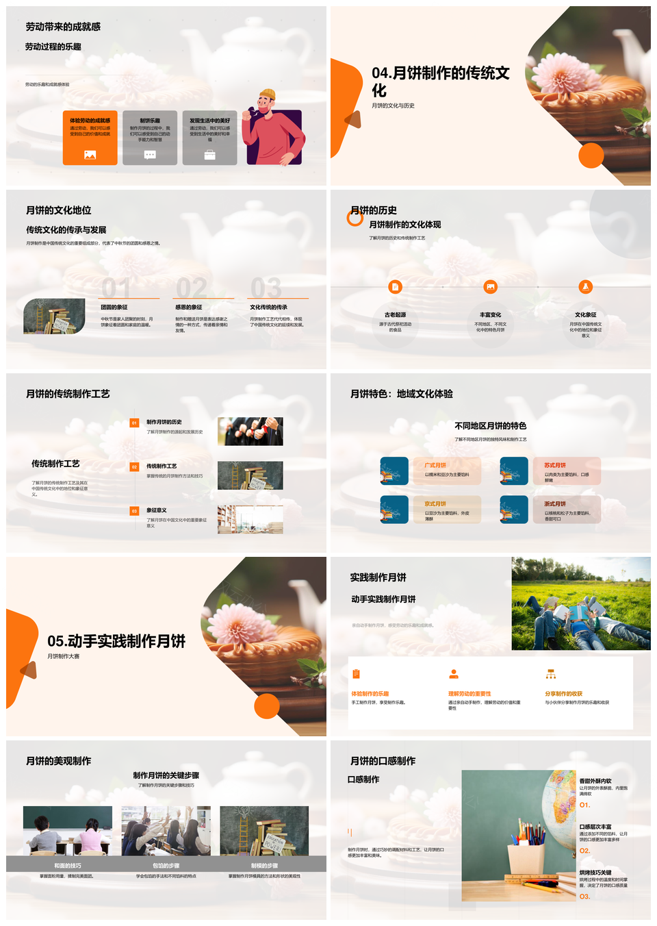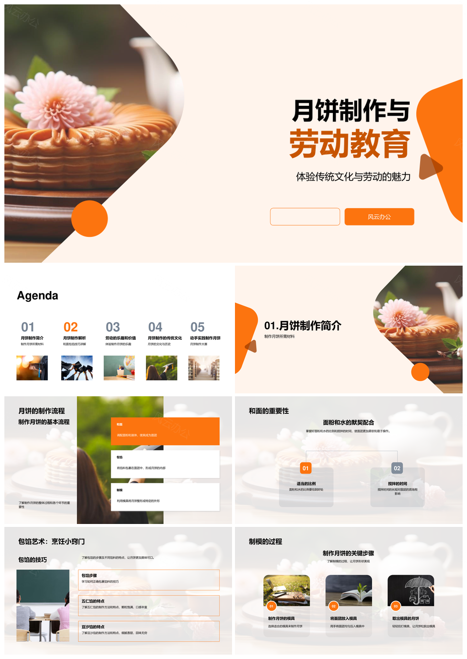 风云办公提供的劳动教育五仁月饼制作传承传统文化PPT模板,下载格式为pptx,一共30页,作品中文字及图均可以修改和编辑,图片更改请在作品中右键图片并更换,文字修改请直接点击文字进行修改。