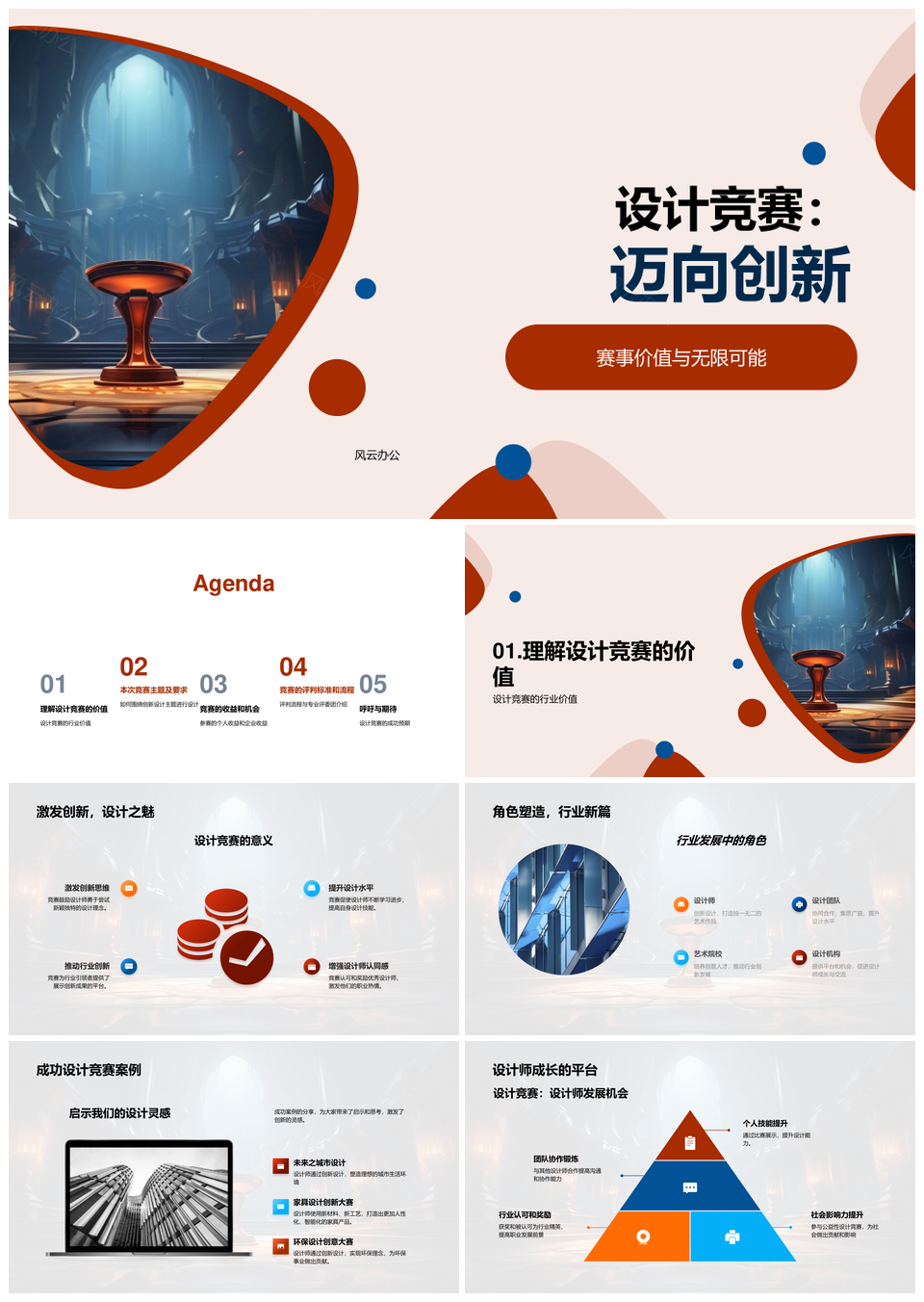风云办公提供的设计竞赛创新引领行业价值发展PPT模板,下载格式为pptx,一共33页,作品中文字及图均可以修改和编辑,图片更改请在作品中右键图片并更换,文字修改请直接点击文字进行修改。
