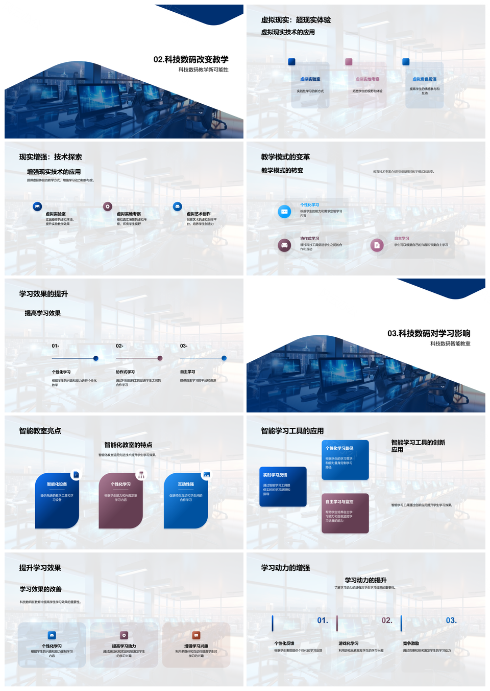 这是一张科技革新教育在线平台智能教室VRAR数码应用PPT模板,包含科技、革新、教育、在线平台、智能教室、VRAR、数码应用等主题内容,也可用作科技革新教育在线平台智能教室、教育在线平台智能教室VRAR、在线平台智能教室VRAR数码应用、科技革新教育在线平台、教育在线平台智能教室、在线平台智能教室VRAR、智能教室VRAR数码应用、科技革新教育在线平台智能、教育在线平台智能教室VRAR、在线平台智能教室VRAR数码、科技革新教育在线、教育在线平台智能、在线平台智能教室VR、智能教室VRAR数码、VRAR数码应用等PPT场景使用。 风云办公提供的科技革新教育在线平台智能教室VRAR数码应用PPT模板,下载格式为pptx,一共28页,作品中文字及图均可以修改和编辑,图片更改请在作品中右键图片并更换,文字修改请直接点击文字进行修改。