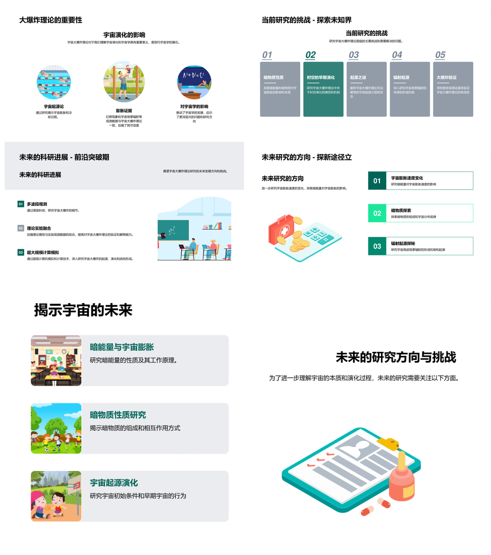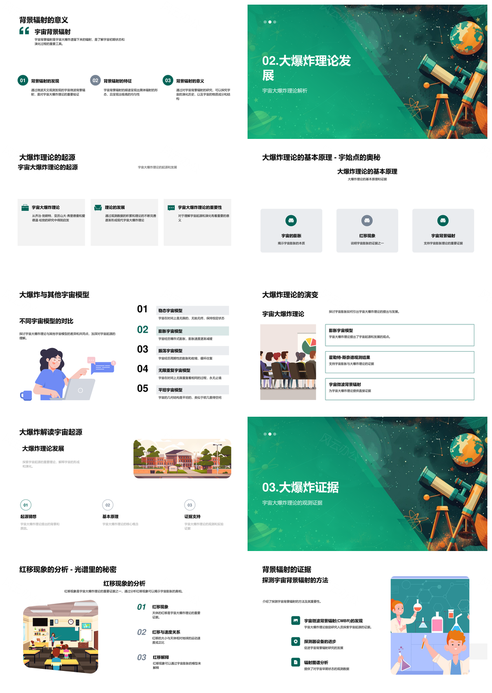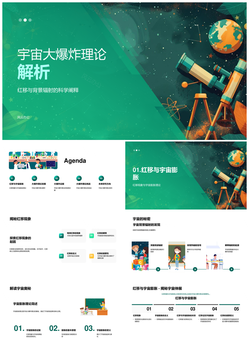 这是一张宇宙大爆炸理论红移背景辐射膨胀模型挑战进展PPT模板,包含宇宙大爆炸、理论、红移、背景辐射、膨胀模型、挑战、进展等主题内容,也可用作红移背景辐射膨胀模型、宇宙大爆炸理论挑战、宇宙大爆炸理论进展、红移背景辐射膨胀、背景辐射膨胀模型、膨胀模型挑战进展、宇宙大爆炸理论、大爆炸理论红移、理论红移背景辐射、红移背景辐射、背景辐射膨胀、膨胀模型、模型挑战、挑战进展、大爆炸理论等PPT场景使用。 风云办公提供的宇宙大爆炸理论红移背景辐射膨胀模型挑战进展PPT模板,下载格式为pptx,一共33页,作品中文字及图均可以修改和编辑,图片更改请在作品中右键图片并更换,文字修改请直接点击文字进行修改。