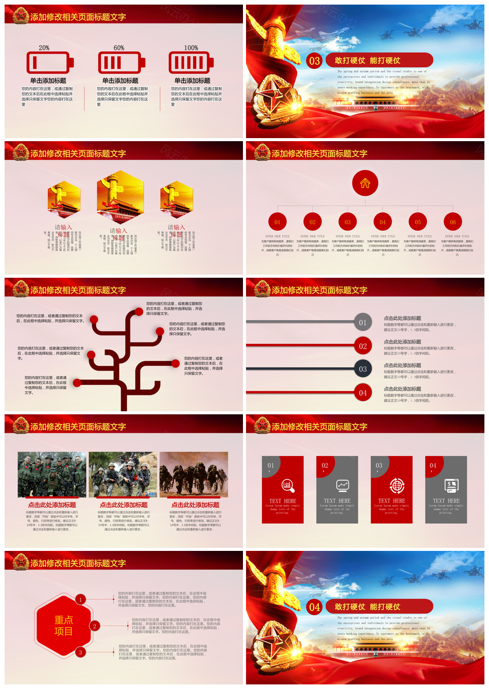 这是一张红色军队系统国防建设八一建军节军队部队军人主题PPT模板,包含红色军队、系统、国防建设、八一建军节、军队、部队、军人、主题等主题内容,也可用作国防建设八一建军节军队系统、八一建军节红色军队部队、红色军队系统国防建设、军队部队军人主题、国防建设八一建军节、红色军队部队军人、八一建军节军队主题、军队系统国防建设、红色军队国防建设、八一建军节部队、军人主题系统、部队军人主题、红色军队部队、国防建设系统、八一建军节军人、军队部队主题、红色军人主题、国防建设军人、军队系统、八一建军节、部队军人、红色军队、国防建设、军人主题等PPT场景使用。 风云办公提供的红色军队系统国防建设八一建军节军队部队军人主题PPT模板,下载格式为pptx,一共35页,作品中文字及图均可以修改和编辑,图片更改请在作品中右键图片并更换,文字修改请直接点击文字进行修改。