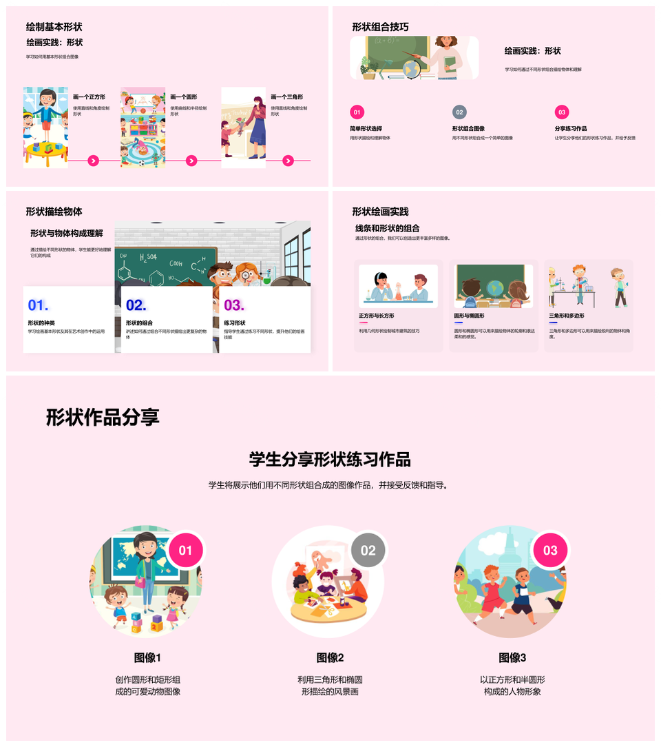 这套模板专为低龄段美术教学场景设计,融合抽象艺术与基础教学需求。以浅粉为基底色,搭配彩虹渐变线条,构建柔和又不失活力的视觉框架。模板采用模块化版式,包含波形插画、激光光束抽象图形等科学元素,通过流动的线条语言将波粒二象性等概念转化为可感知的视觉符号。特别配置了低饱和度分镜页面,供教师拆分绘画步骤,12页图文混排结构兼顾知识密度与留白空间。关键图表区预留可编辑锚点,支持替换矢量素材而不影响基础网格系统,有效降低一年级学生的认知负荷。