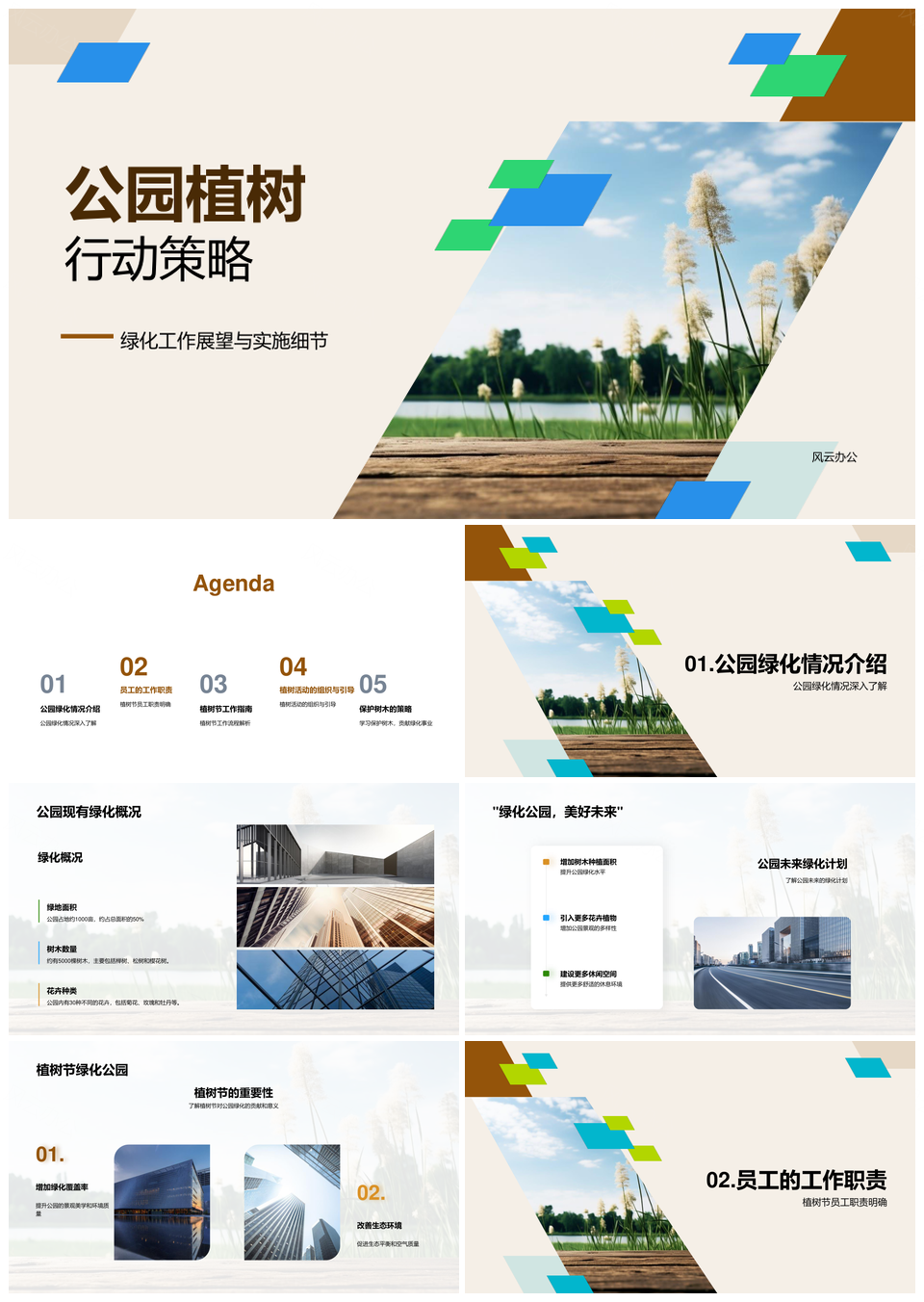 风云办公提供的公园植树节绿化行动策略指南PPT模板,下载格式为pptx,一共23页,作品中文字及图均可以修改和编辑,图片更改请在作品中右键图片并更换,文字修改请直接点击文字进行修改。