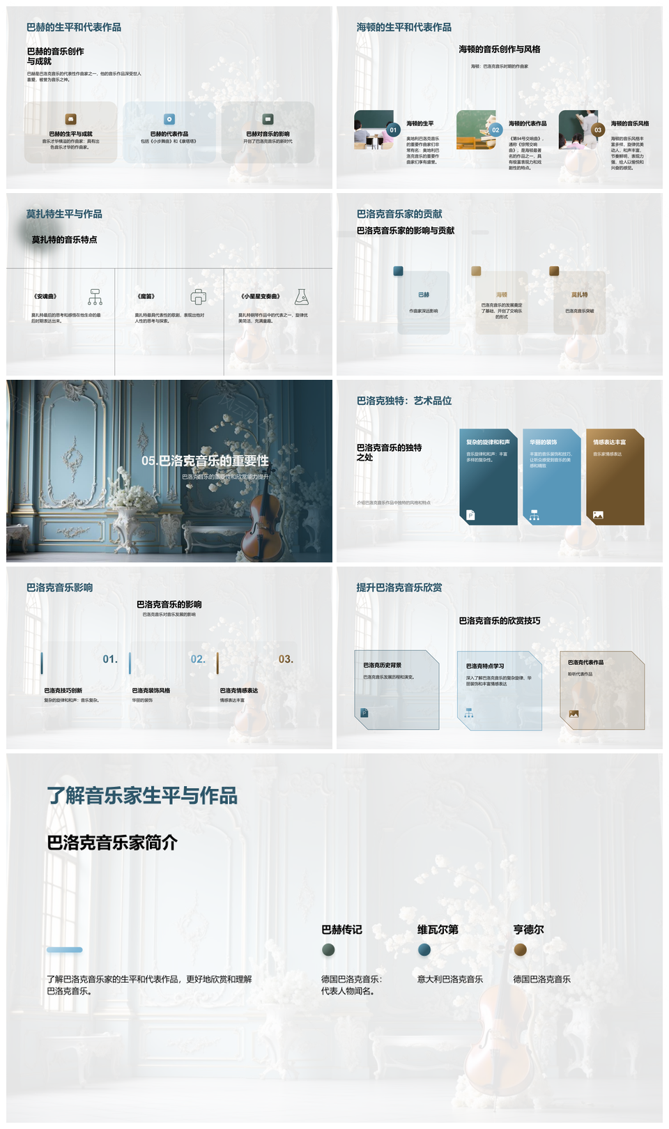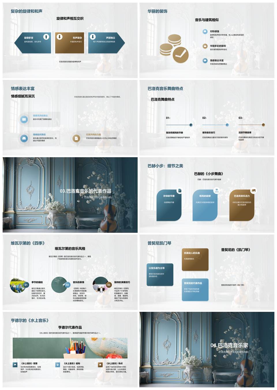 这是一张巴洛克音乐欧洲起源发展繁复旋律和声乐器PPT模板,包含巴洛克音乐、欧洲、起源、发展、繁复、旋律、和声、乐器等主题内容,也可用作巴洛克音乐欧洲起源发展、欧洲起源发展繁复旋律、发展繁复旋律和声音乐、繁复旋律和声音乐器、巴洛克音乐繁复旋律、欧洲起源繁复和声、音乐发展繁复和声、旋律和声音乐器欧洲、巴洛克音乐和声乐器、欧洲发展旋律和声、起源发展旋律和声、发展繁复音乐旋律、繁复和声欧洲音乐、巴洛克音乐欧洲旋律、音乐起源和声乐器等PPT场景使用。 风云办公提供的巴洛克音乐欧洲起源发展繁复旋律和声乐器PPT模板,下载格式为pptx,一共27页,作品中文字及图均可以修改和编辑,图片更改请在作品中右键图片并更换,文字修改请直接点击文字进行修改。