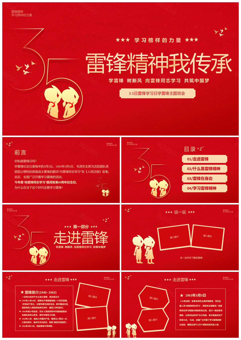 这是一张红色儿童3月5日学雷锋纪念日主题班会PPT模板,包含红色儿童、学雷锋纪念日、主题班会等主题内容,也可用作3月5日学雷锋纪念日主题班会、红色儿童学雷锋纪念日主题班会、3月5日学雷锋纪念日、学雷锋纪念日主题班会、红色儿童3月5日学雷锋、红色儿童学雷锋纪念日、红色儿童纪念日主题班会、3月5日学雷锋、学雷锋纪念日、纪念日主题班会、红色儿童主题班会、红色儿童3月5日、学雷锋主题班会、红色儿童学雷锋、红色儿童纪念日等PPT场景使用。 风云办公提供的红色儿童3月5日学雷锋纪念日主题班会PPT模板,下载格式为pptx,一共25页,作品中文字及图均可以修改和编辑,图片更改请在作品中右键图片并更换,文字修改请直接点击文字进行修改。