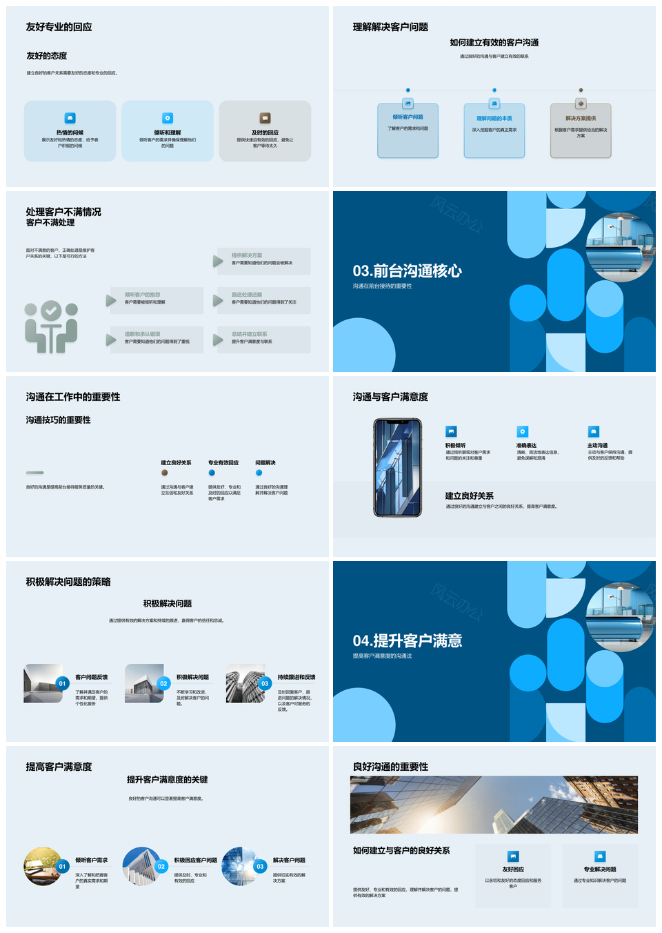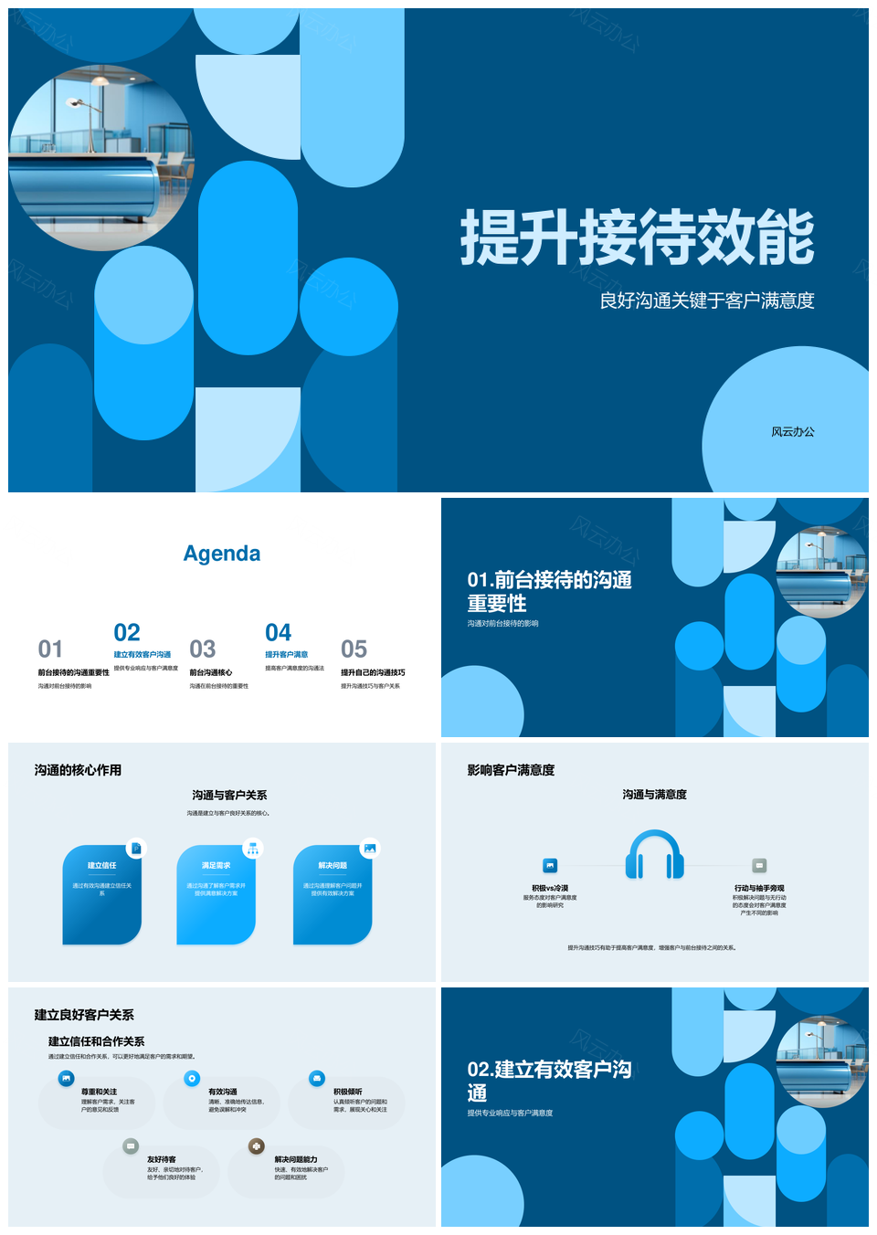 风云办公提供的前台接待培训提升沟通效能客户满意PPT模板,下载格式为pptx,一共23页,作品中文字及图均可以修改和编辑,图片更改请在作品中右键图片并更换,文字修改请直接点击文字进行修改。
