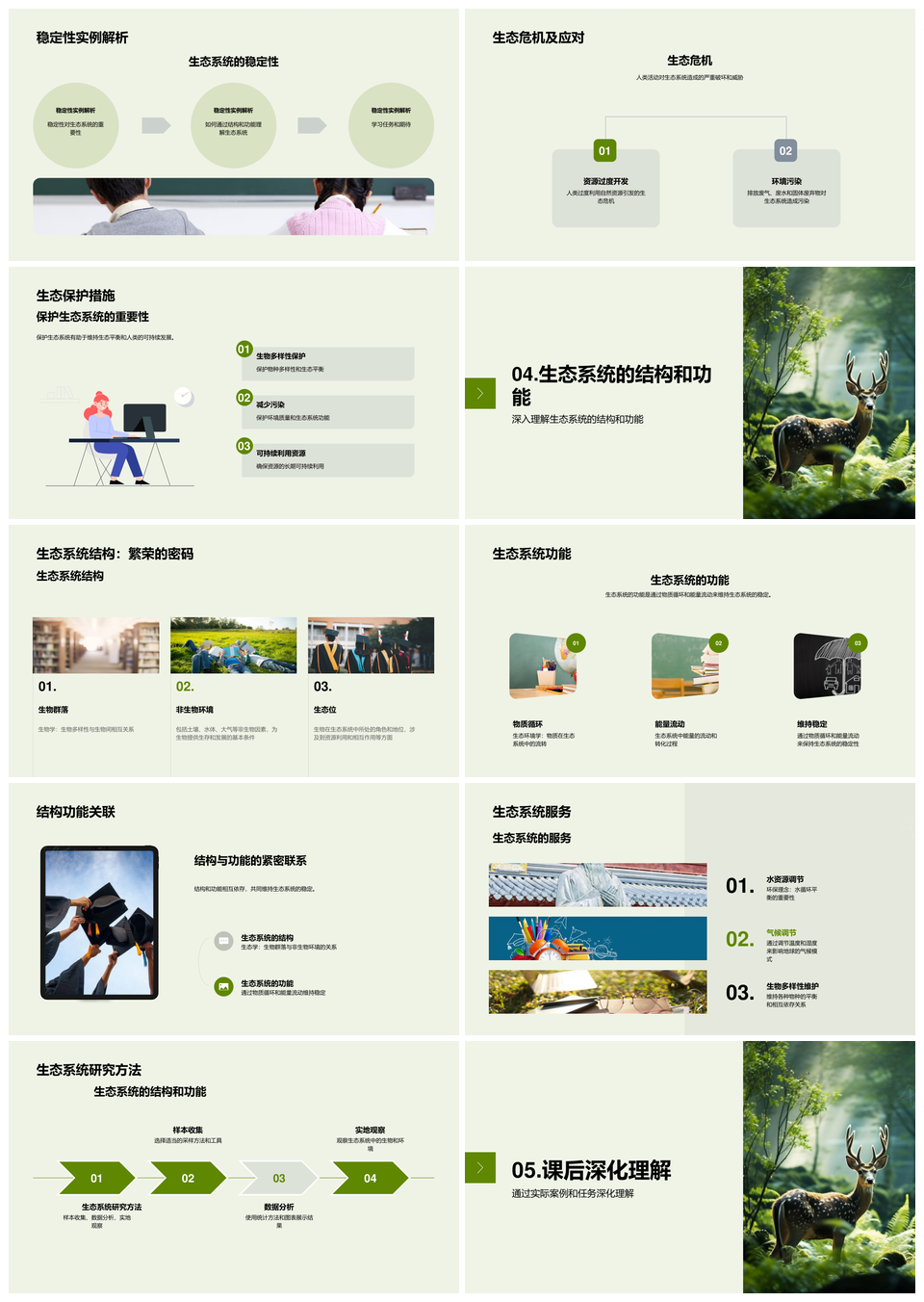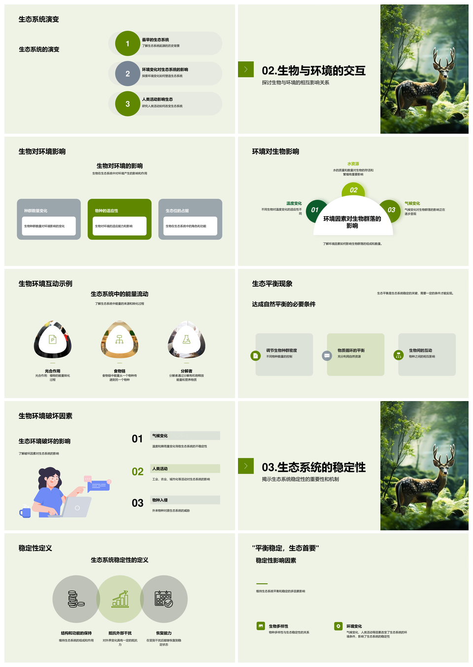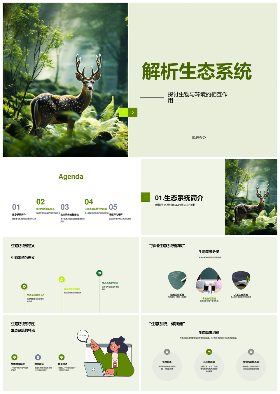 这是一张生态系统结构功能稳定性及森林保护解析PPT模板,包含生态系统、结构、功能、稳定性、森林保护、解析等主题内容,也可用作生态系统结构功能稳定性、结构功能稳定性森林、功能稳定性森林保护、稳定性森林保护解析、生态系统结构功能、结构功能稳定性、功能稳定性森林、稳定性森林保护、森林保护解析、生态系统结构、结构功能、功能稳定性、稳定性森林、森林保护、保护解析等PPT场景使用。 风云办公提供的生态系统结构功能稳定性及森林保护解析PPT模板,下载格式为pptx,一共33页,作品中文字及图均可以修改和编辑,图片更改请在作品中右键图片并更换,文字修改请直接点击文字进行修改。