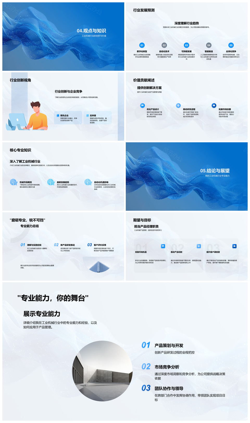 这是一张工业机械产品经理趋势创新自动化述职报告PPT模板,包含工业机械、产品经理、趋势、创新、自动化、述职报告等主题内容,也可用作工业机械产品经理趋势创新自动化、工业机械产品经理趋势创新、产品经理趋势创新自动化述职报告、趋势创新自动化述职报告、工业机械创新自动化述职报告、机械产品经理趋势创新自动化、工业机械产品经理趋势、产品经理趋势创新自动化、趋势创新自动化述职、工业机械创新自动化、机械产品经理趋势创新、产品经理创新自动化、工业机械产品经理、趋势创新自动化、机械产品经理趋势、创新自动化述职报告等PPT场景使用。 风云办公提供的工业机械产品经理趋势创新自动化述职报告PPT模板,下载格式为pptx,一共27页,作品中文字及图均可以修改和编辑,图片更改请在作品中右键图片并更换,文字修改请直接点击文字进行修改。