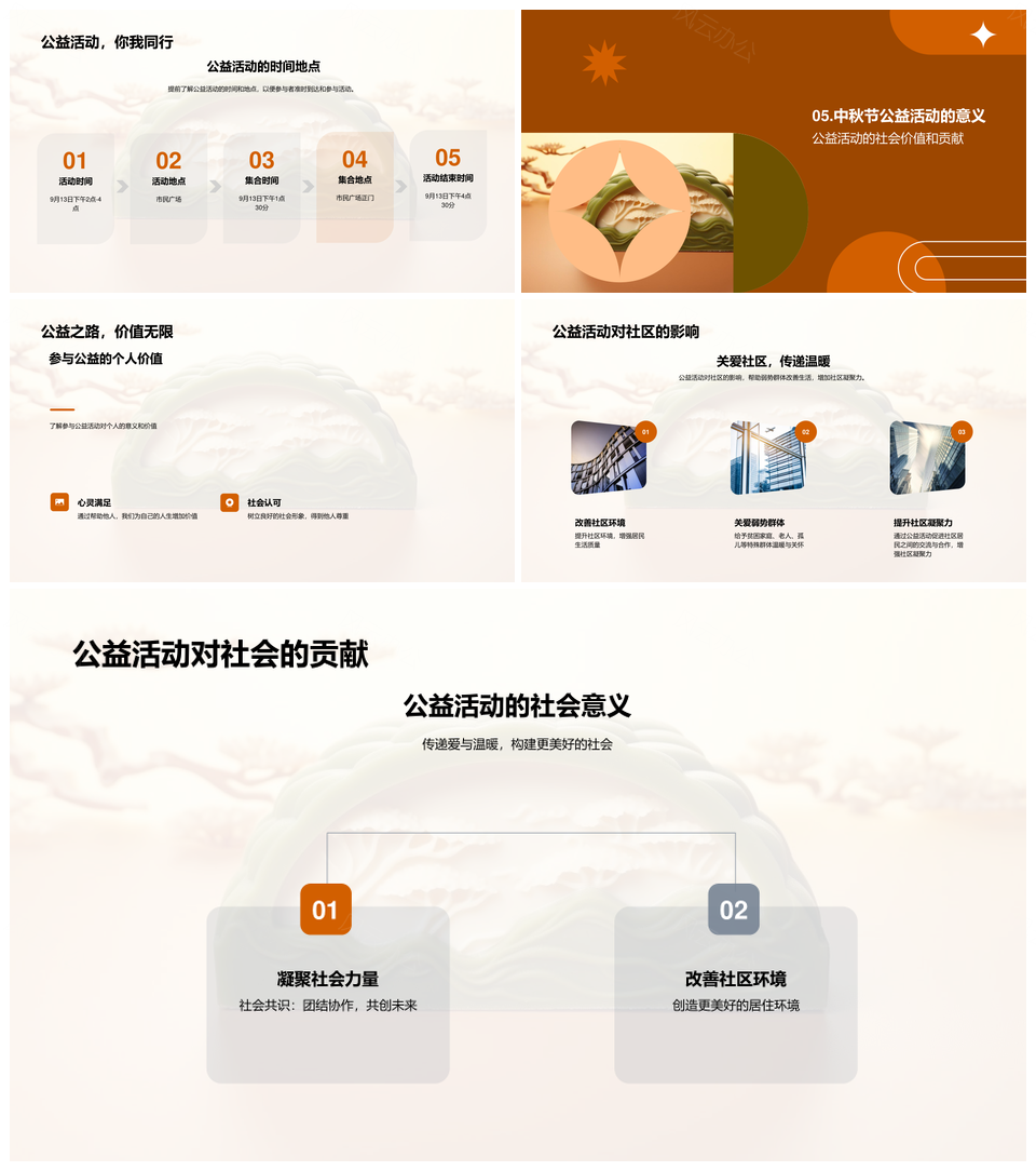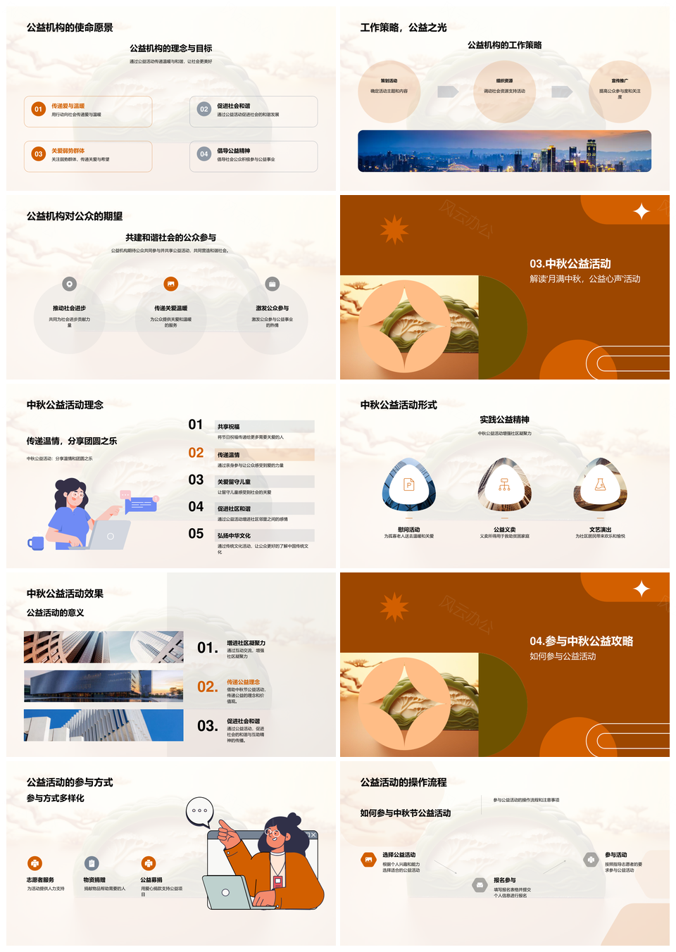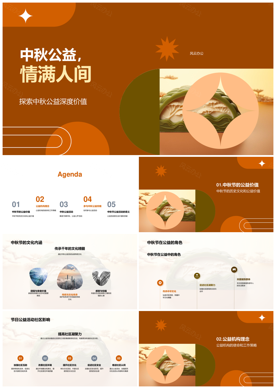 风云办公提供的中秋公益暖社区月饼传递心声PPT模板,下载格式为pptx,一共23页,作品中文字及图均可以修改和编辑,图片更改请在作品中右键图片并更换,文字修改请直接点击文字进行修改。