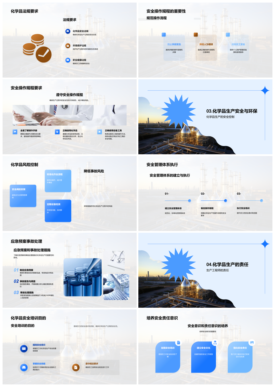 这是一张化学品安全生产环保操作规程防爆防火中毒PPT模板,包含化学品、安全生产、环保、操作规程、防爆、防火、中毒等主题内容,也可用作化学品安全生产环保操作规程、安全生产环保操作规程防爆、环保操作规程防爆防火、化学品安全生产防爆防火、化学品环保操作防爆防火、安全生产环保操作防爆防火、化学品安全生产规程、安全生产环保操作、环保操作防爆、防爆防火规程、安全生产防爆防火、化学品防爆防火、防爆防火、安全生产防爆、环保操作防爆等PPT场景使用。 风云办公提供的化学品安全生产环保操作规程防爆防火中毒PPT模板,下载格式为pptx,一共23页,作品中文字及图均可以修改和编辑,图片更改请在作品中右键图片并更换,文字修改请直接点击文字进行修改。