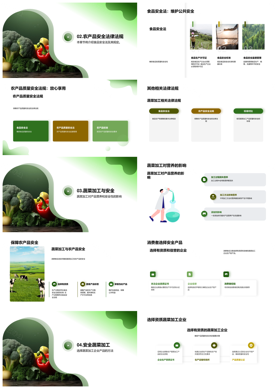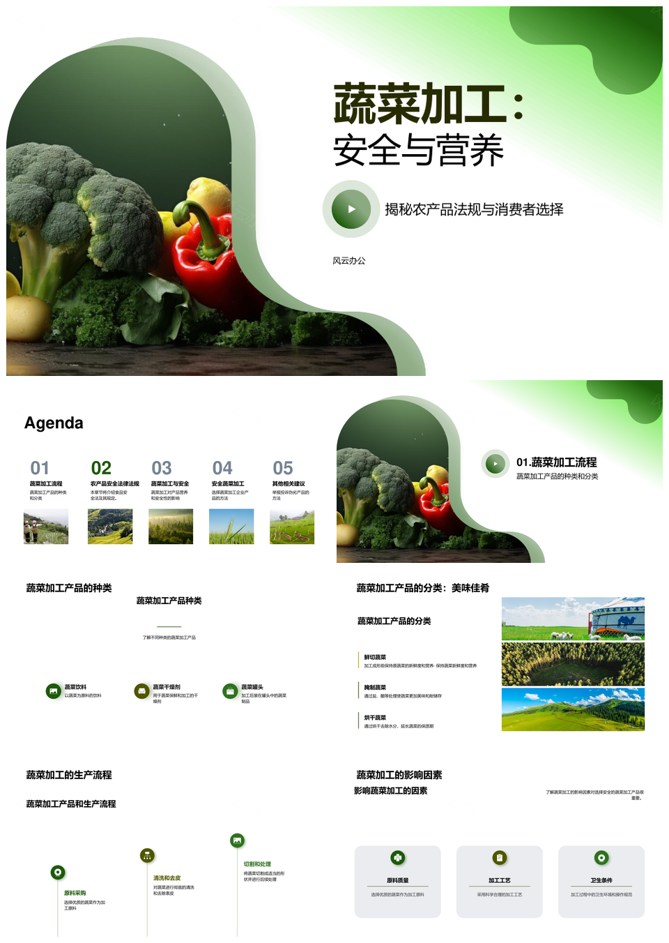 风云办公提供的蔬菜加工安全法生产流程营养影响因素PPT模板,下载格式为pptx,一共24页,作品中文字及图均可以修改和编辑,图片更改请在作品中右键图片并更换,文字修改请直接点击文字进行修改。