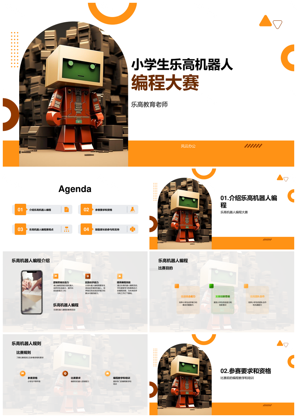 风云办公提供的小学生乐高教育机器人编程能力赛PPT模板,下载格式为pptx,一共21页,作品中文字及图均可以修改和编辑,图片更改请在作品中右键图片并更换,文字修改请直接点击文字进行修改。