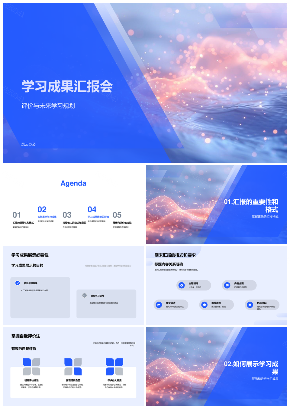 风云办公提供的学习成果自评总结与计划展示汇报PPT模板,下载格式为pptx,一共23页,作品中文字及图均可以修改和编辑,图片更改请在作品中右键图片并更换,文字修改请直接点击文字进行修改。