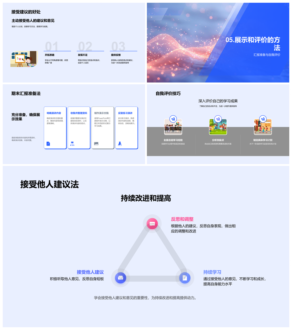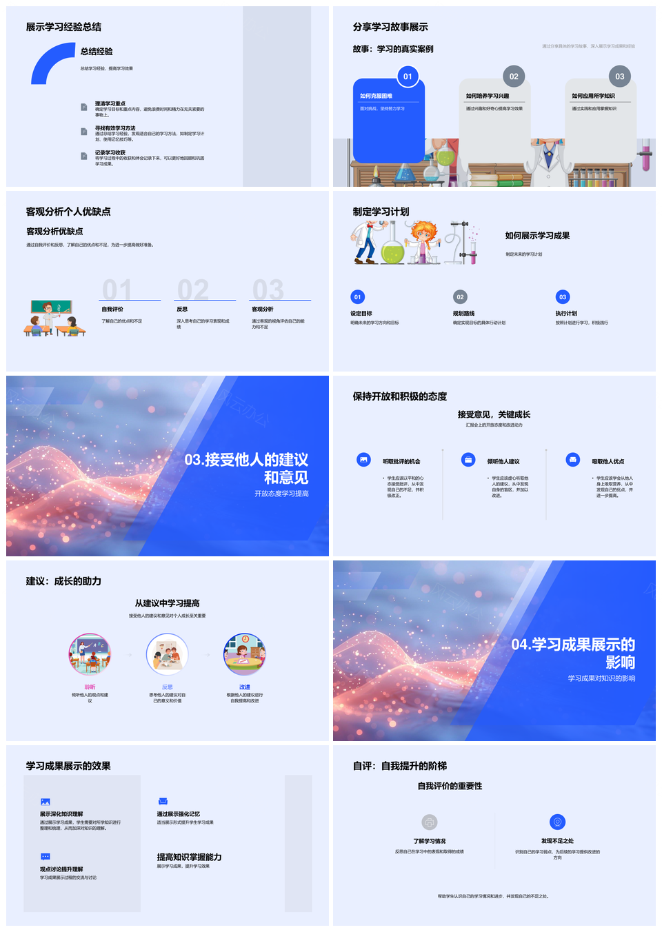 这是一张学习成果自评总结与计划展示汇报PPT模板,包含学习成果、自评、总结、计划、展示、汇报等主题内容,也可用作学习成果自评总结计划、自评总结计划展示、总结计划展示汇报、学习成果自评总结、自评总结计划、总结计划展示、计划展示汇报、学习成果自评、自评总结、总结计划、计划展示、展示汇报、学习成果总结、学习成果展示、学习成果汇报等PPT场景使用。