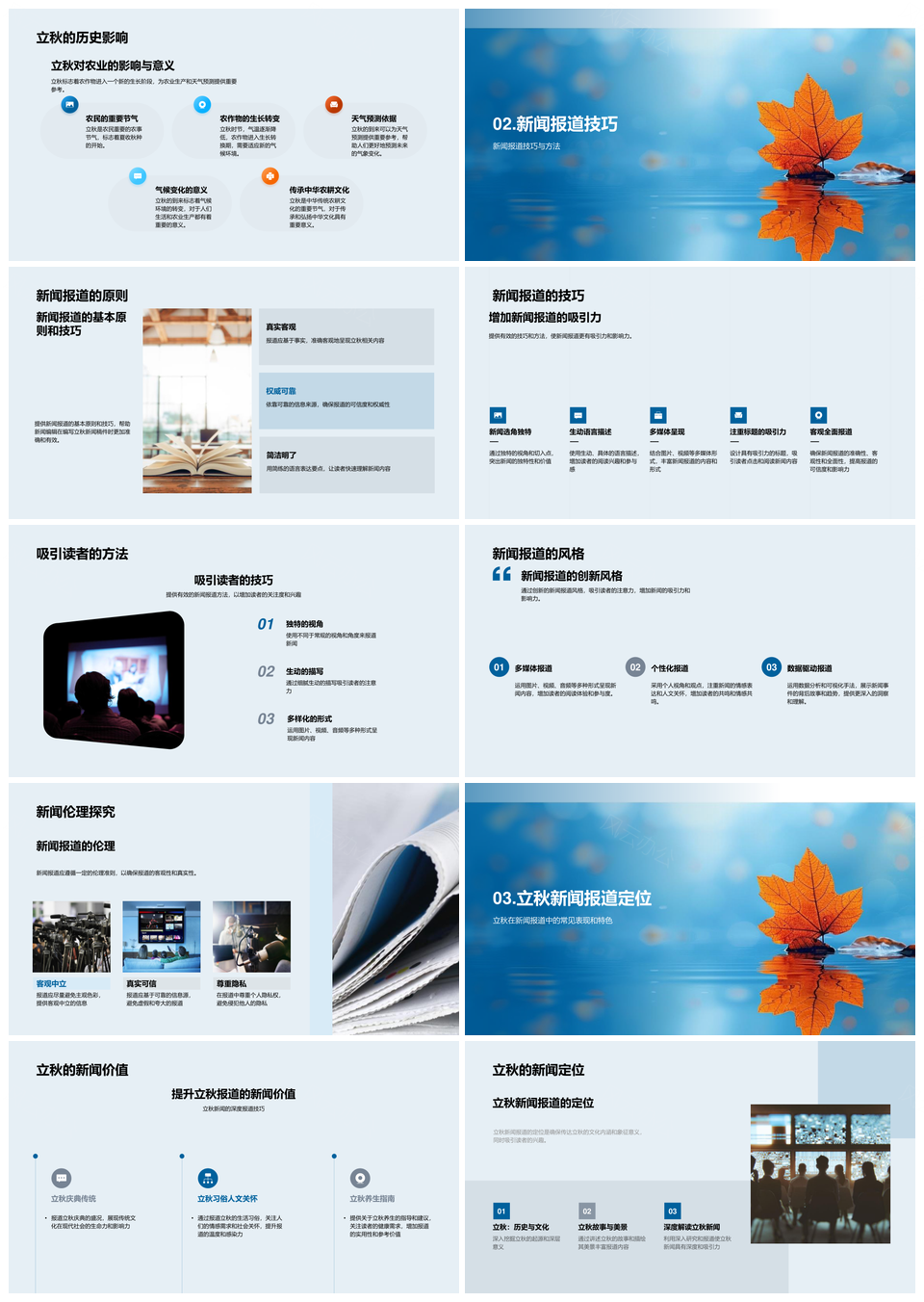 这是一张立秋新闻编辑技巧历史文化象征习俗故事讲座PPT模板,包含立秋、新闻编辑、技巧、历史文化、象征、习俗、故事、讲座等主题内容,也可用作立秋新闻编辑技巧历史文化象征习俗故事讲座、新闻编辑技巧历史文化象征、立秋历史文化象征习俗故事、立秋新闻编辑历史文化、编辑技巧历史习俗故事、立秋习俗故事讲座历史、新闻编辑象征习俗故事、文化象征习俗故事讲座、立秋新闻技巧习俗讲座、历史文化象征习俗故事、新闻编辑历史文化象征、技巧历史习俗故事、立秋象征习俗故事、新闻历史文化故事、编辑技巧习俗讲座等PPT场景使用。 风云办公提供的立秋新闻编辑技巧历史文化象征习俗故事讲座PPT模板,下载格式为pptx,一共33页,作品中文字及图均可以修改和编辑,图片更改请在作品中右键图片并更换,文字修改请直接点击文字进行修改。