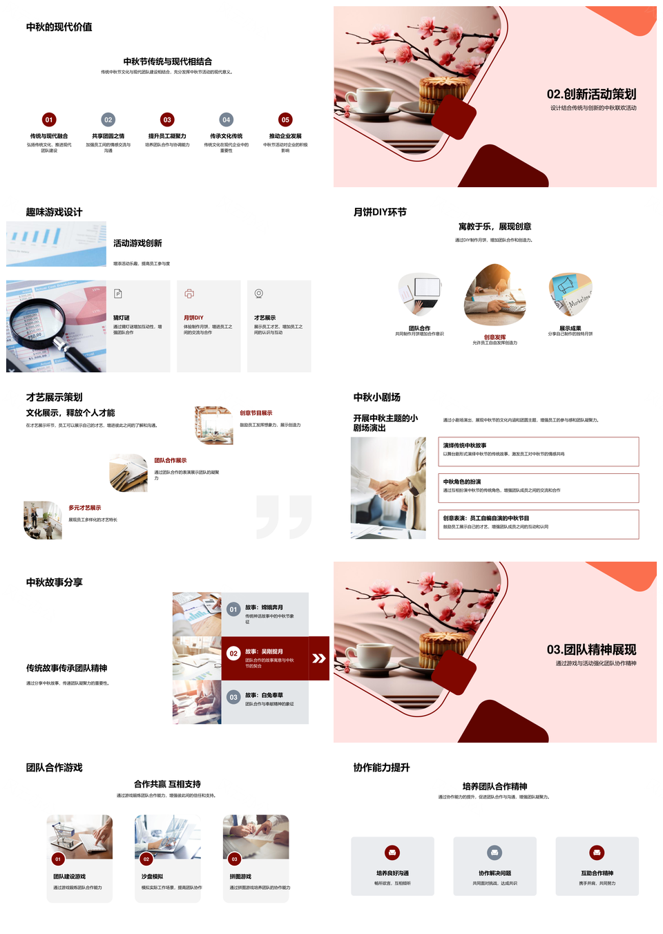 风云办公提供的中秋团圆共制月饼凝聚团队协作活力PPT模板,下载格式为pptx,一共33页,作品中文字及图均可以修改和编辑,图片更改请在作品中右键图片并更换,文字修改请直接点击文字进行修改。