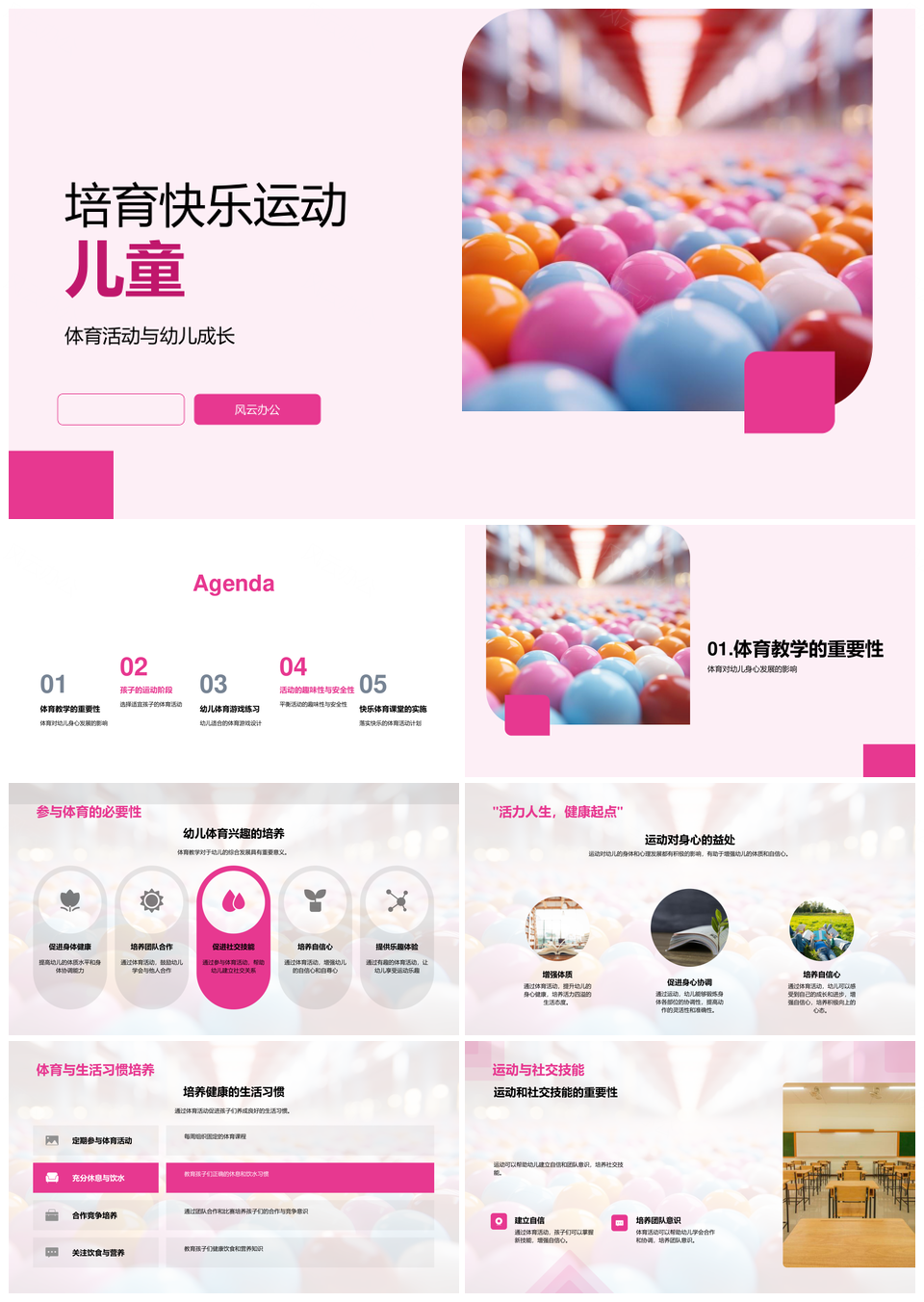风云办公提供的快乐运动助力幼儿身心成长PPT模板,下载格式为pptx,一共24页,作品中文字及图均可以修改和编辑,图片更改请在作品中右键图片并更换,文字修改请直接点击文字进行修改。