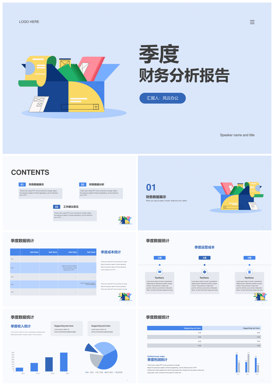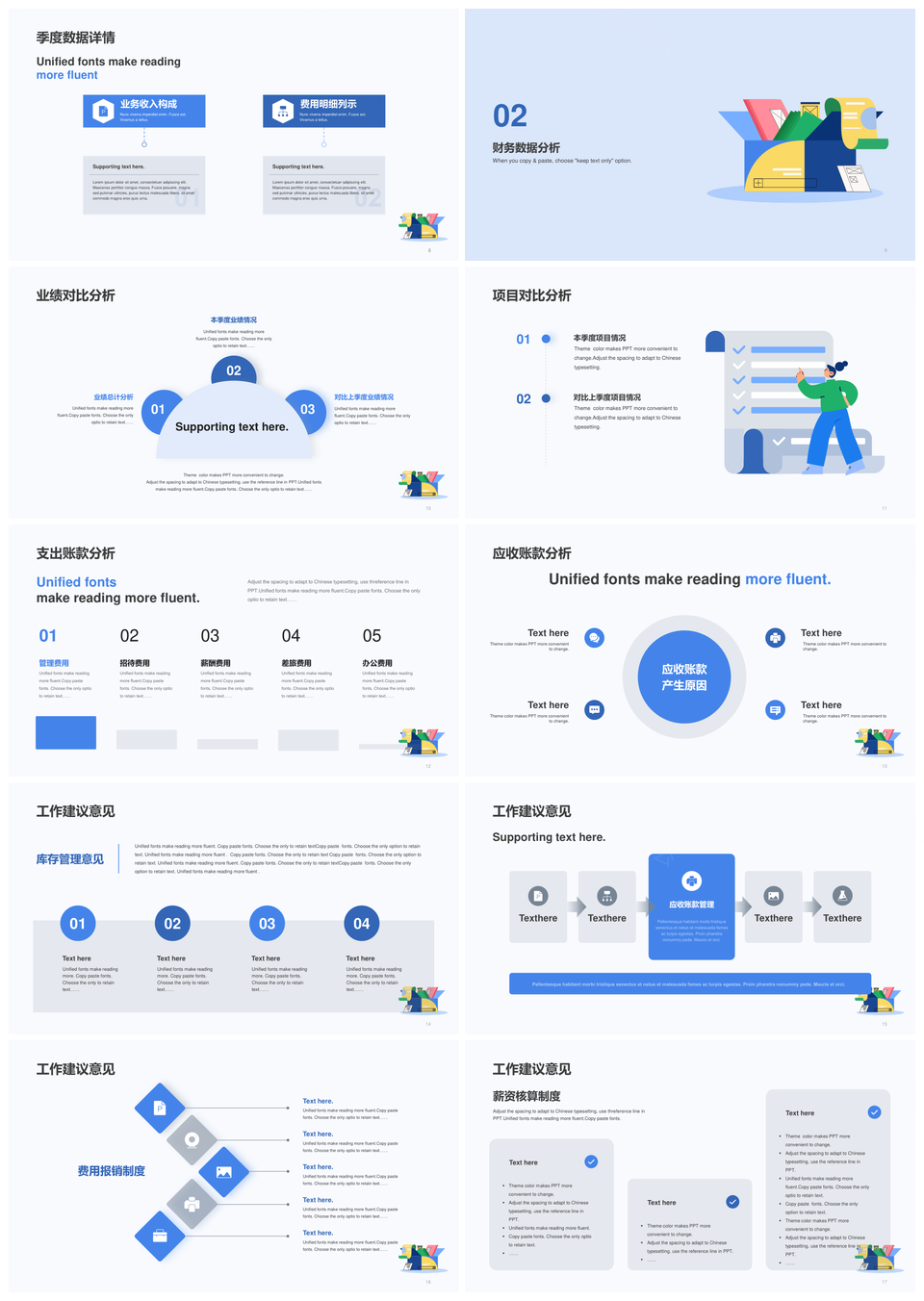 风云办公提供的蓝黄扁平插画财务季度总结报告PPT模板,下载格式为pptx,一共18页,作品中文字及图均可以修改和编辑,图片更改请在作品中右键图片并更换,文字修改请直接点击文字进行修改。