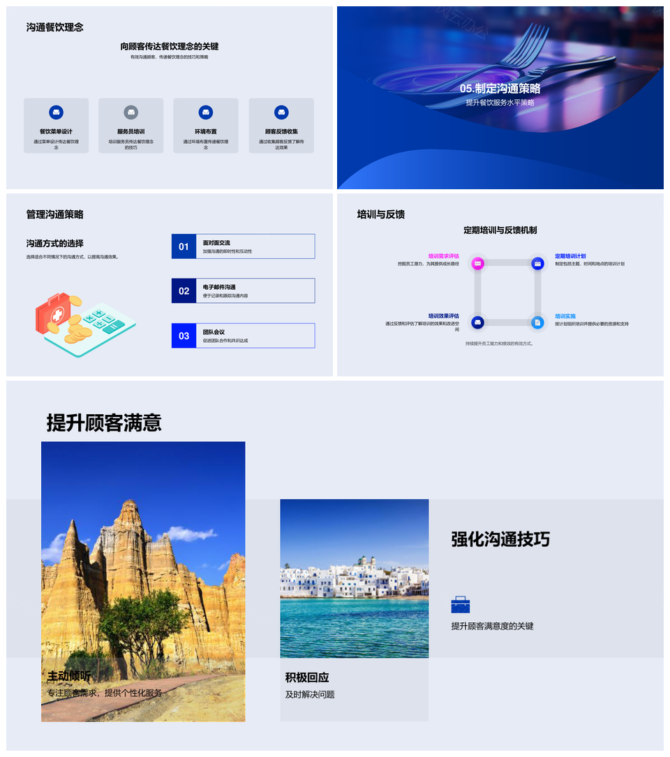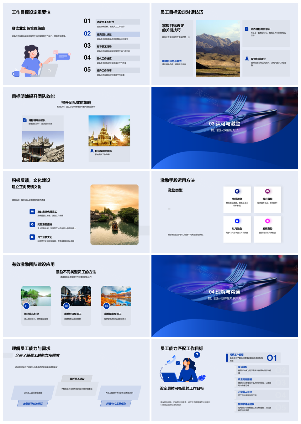 这是一张餐饮管理效能提升目标沟通与团队正向反馈PPT模板,包含餐饮管理、效能提升、目标沟通、团队正向反馈等主题内容,也可用作餐饮管理效能提升目标、效能提升目标沟通、提升目标沟通团队、目标沟通团队正向反馈、餐饮管理效能提升、效能提升目标、提升目标沟通、目标沟通团队、沟通团队正向反馈、餐饮管理效能、效能提升、提升目标、目标沟通、沟通团队、团队正向反馈等PPT场景使用。 风云办公提供的餐饮管理效能提升目标沟通与团队正向反馈PPT模板,下载格式为pptx,一共23页,作品中文字及图均可以修改和编辑,图片更改请在作品中右键图片并更换,文字修改请直接点击文字进行修改。