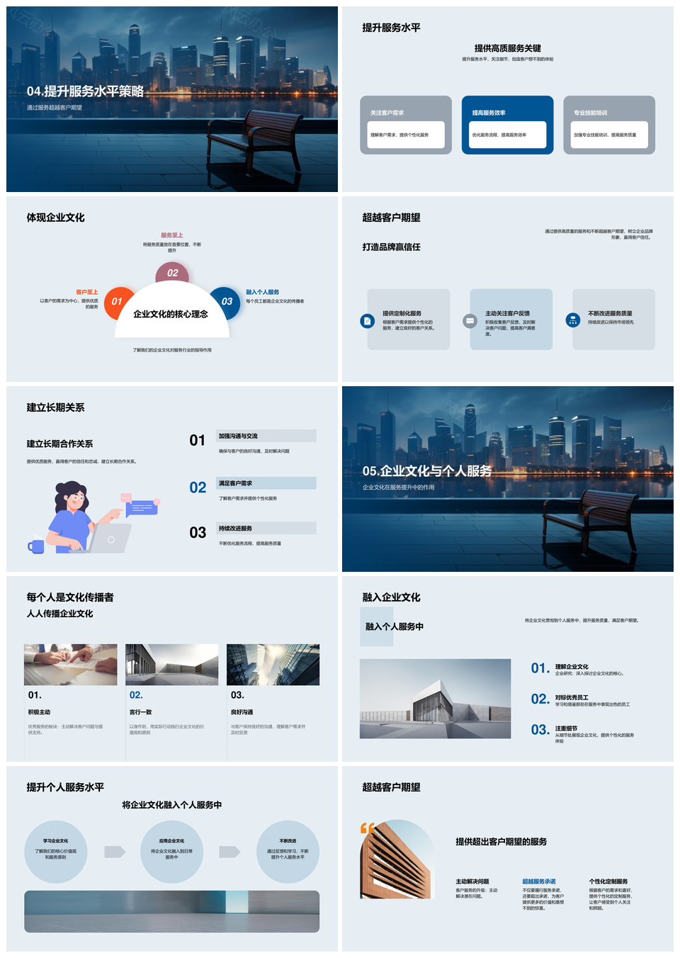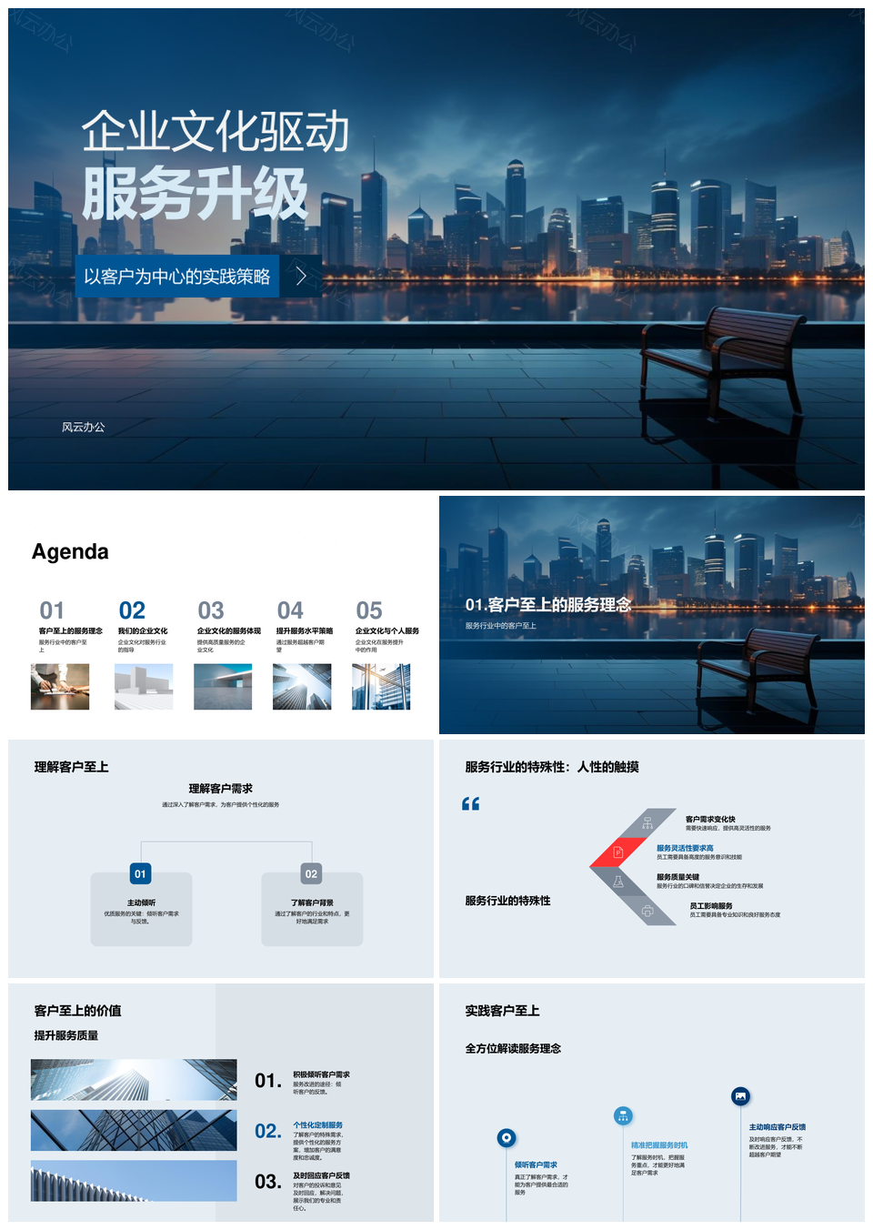 风云办公提供的企业文化驱动客户至上高质量服务升级PPT模板,下载格式为pptx,一共28页,作品中文字及图均可以修改和编辑,图片更改请在作品中右键图片并更换,文字修改请直接点击文字进行修改。