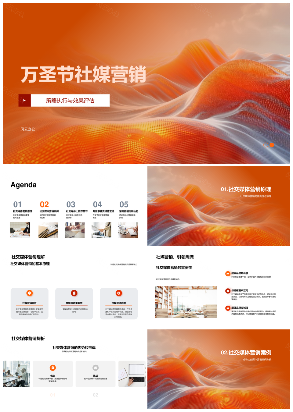这是一张万圣节社媒营销策略执行效果评估案例分析PPT模板,包含万圣节、社媒、营销、策略、执行、效果、评估、案例分析等主题内容,也可用作万圣节社媒营销策略执行效果、社媒营销策略执行效果评估、营销策略执行效果评估案例分析、万圣节社媒营销策略、社媒营销策略执行效果、营销策略执行效果评估、执行效果评估案例分析、万圣节社媒案例分析、社媒执行效果评估、营销策略案例分析、万圣节社媒、社媒营销策略、营销策略执行效果、执行效果评估、评估案例分析等PPT场景使用。 风云办公提供的万圣节社媒营销策略执行效果评估案例分析PPT模板,下载格式为pptx,一共23页,作品中文字及图均可以修改和编辑,图片更改请在作品中右键图片并更换,文字修改请直接点击文字进行修改。