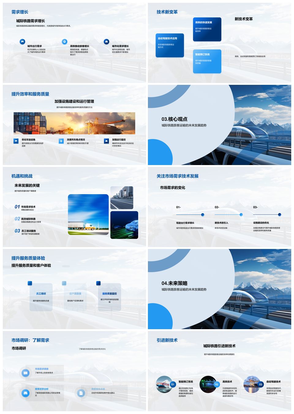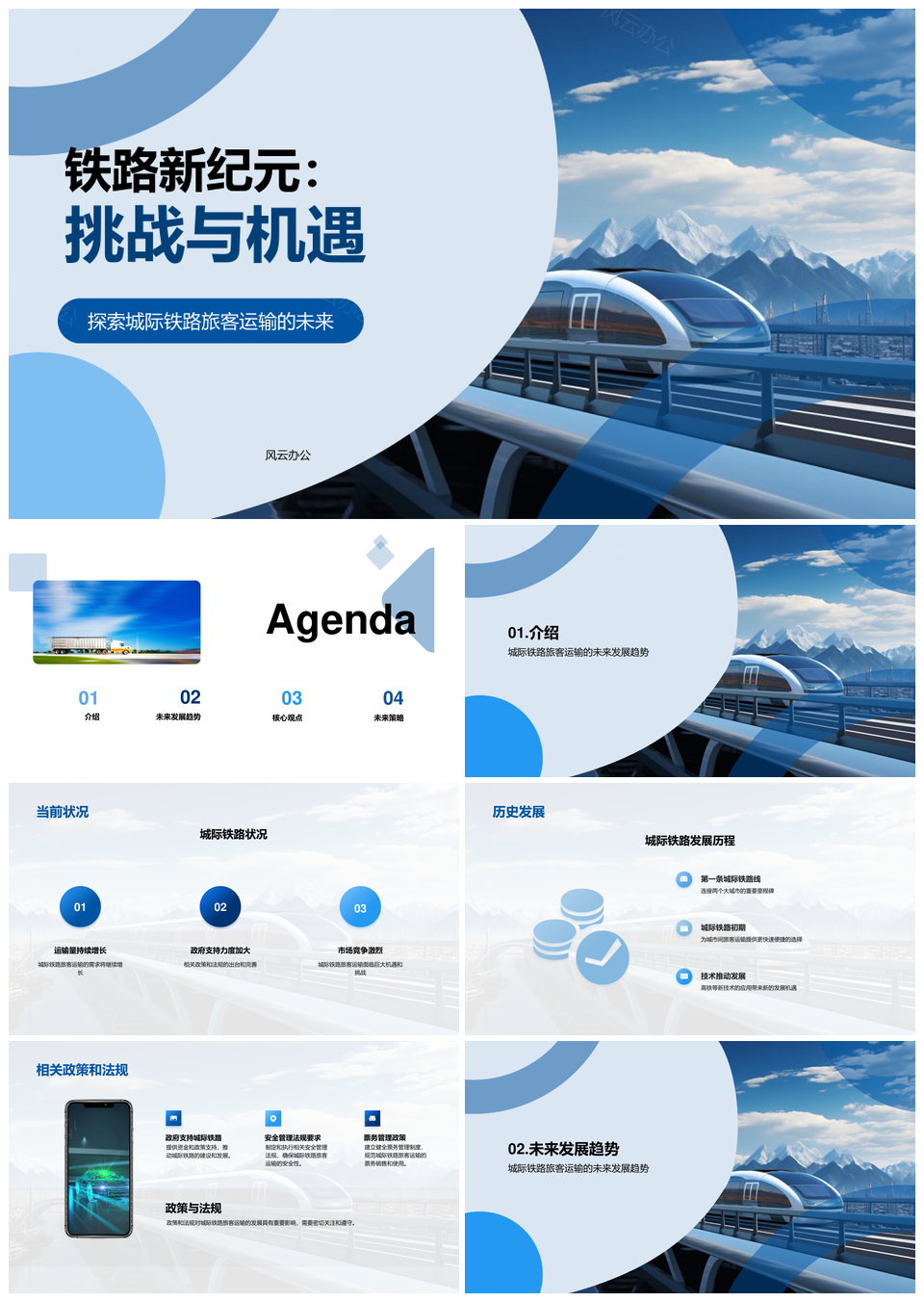 风云办公提供的未来城际铁路智慧出行发展新趋势PPT模板,下载格式为pptx,一共19页,作品中文字及图均可以修改和编辑,图片更改请在作品中右键图片并更换,文字修改请直接点击文字进行修改。