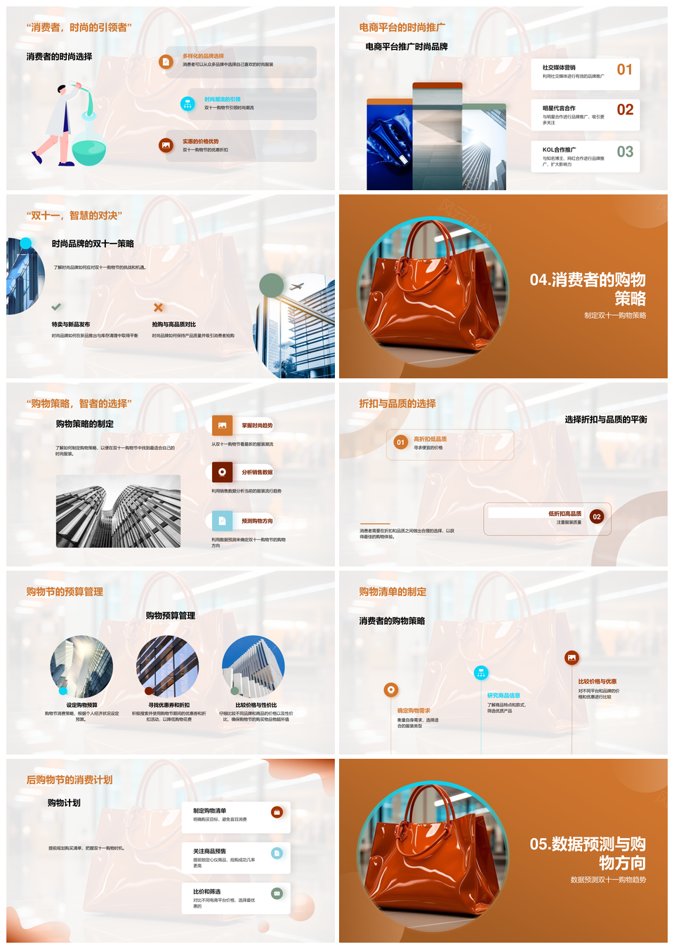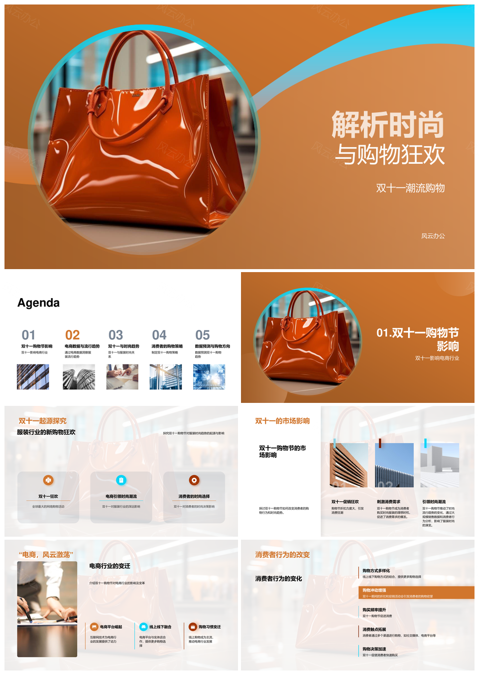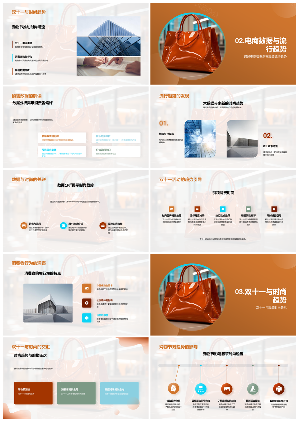 这是一张双十一电商销售数据解析时尚趋势与消费行为PPT模板,包含双十一、电商、销售数据、解析、时尚趋势、消费行为等主题内容,也可用作双十一电商销售数据解析、电商销售数据解析时尚趋势、双十一电商解析时尚趋势、双十一电商解析消费行为、电商解析时尚趋势消费行为、销售数据解析时尚趋势消费行为、电商销售数据解析、销售数据解析时尚趋势、解析时尚趋势消费行为、电商解析时尚趋势、电商解析消费行为、双十一电商销售数据、销售数据解析消费行为、解析时尚趋势、时尚趋势消费行为等PPT场景使用。 风云办公提供的双十一电商销售数据解析时尚趋势与消费行为PPT模板,下载格式为pptx,一共33页,作品中文字及图均可以修改和编辑,图片更改请在作品中右键图片并更换,文字修改请直接点击文字进行修改。