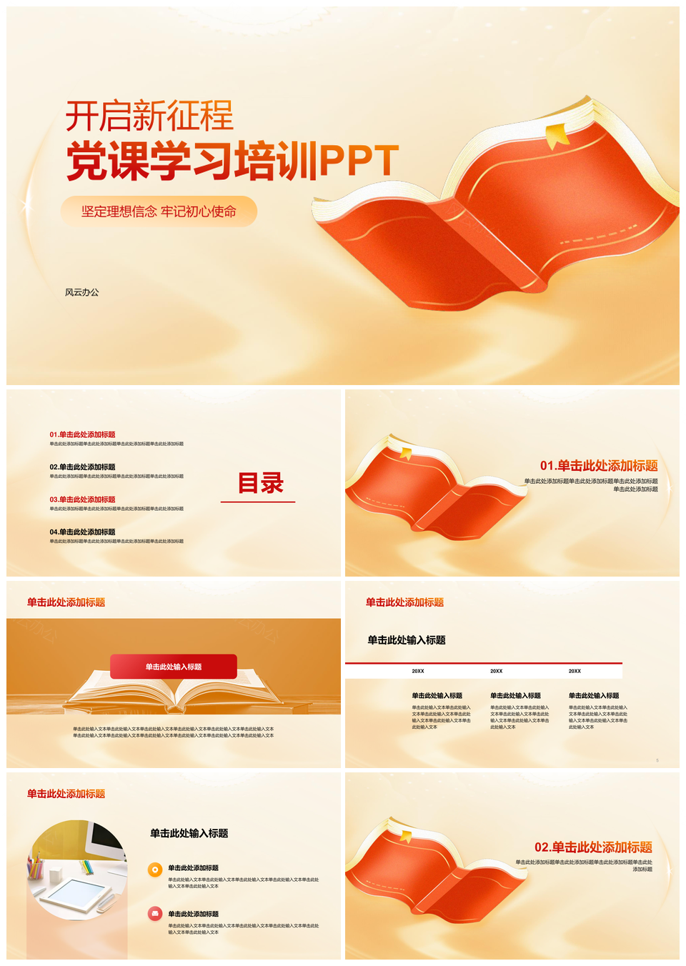 红黄渐变插画书党课培训启征程PPT模板推荐