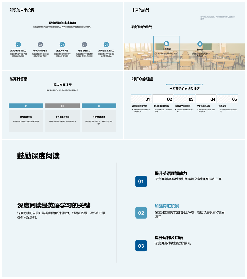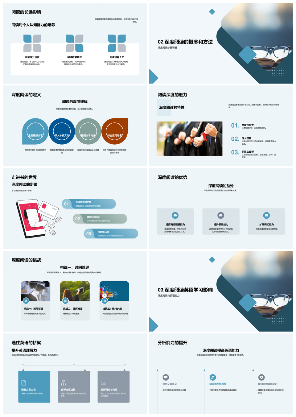这是一张深度阅读提升英语词汇写作口语理解力PPT模板,包含深度阅读、提升、英语、词汇、写作、口语、理解力等主题内容,也可用作深度阅读提升英语、阅读提升英语词汇、提升英语词汇写作、英语词汇写作口语、深度阅读提升、阅读提升英语、提升英语词汇、英语词汇写作、词汇写作口语、深度阅读、阅读提升、提升英语、英语词汇、词汇写作、写作口语等PPT场景使用。