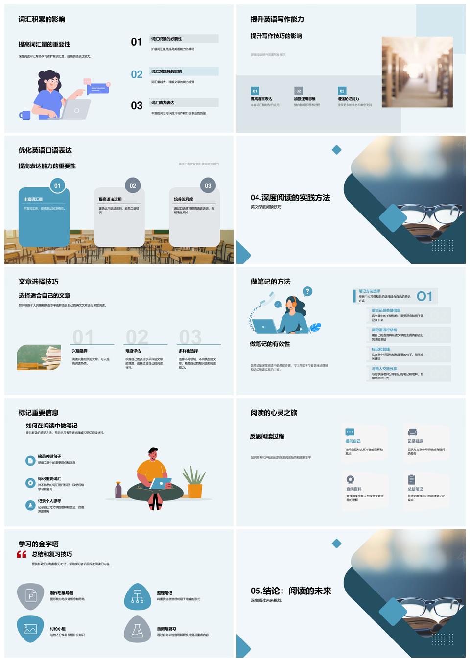 风云办公提供的深度阅读提升英语词汇写作口语理解力PPT模板,下载格式为pptx,一共33页,作品中文字及图均可以修改和编辑,图片更改请在作品中右键图片并更换,文字修改请直接点击文字进行修改。