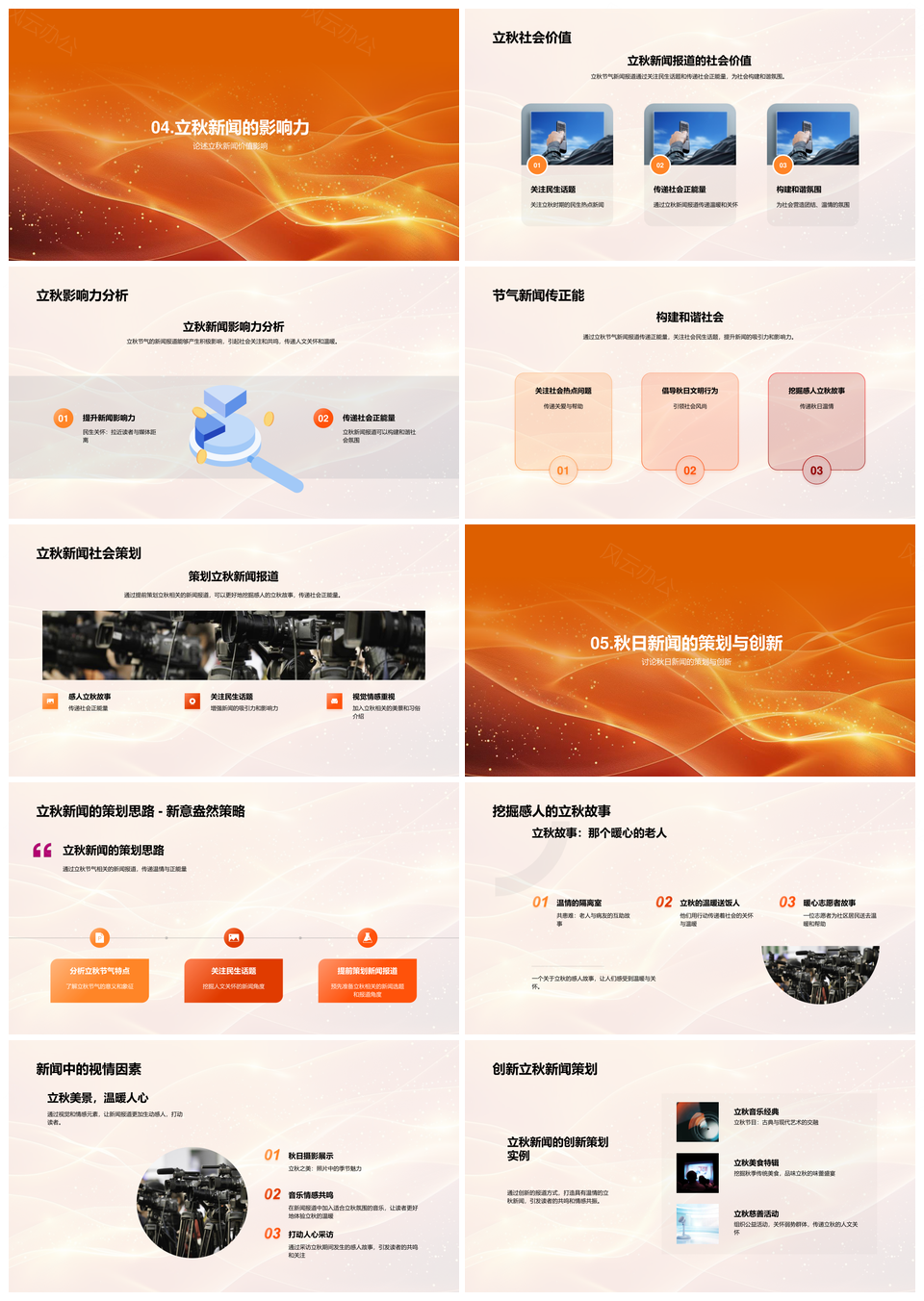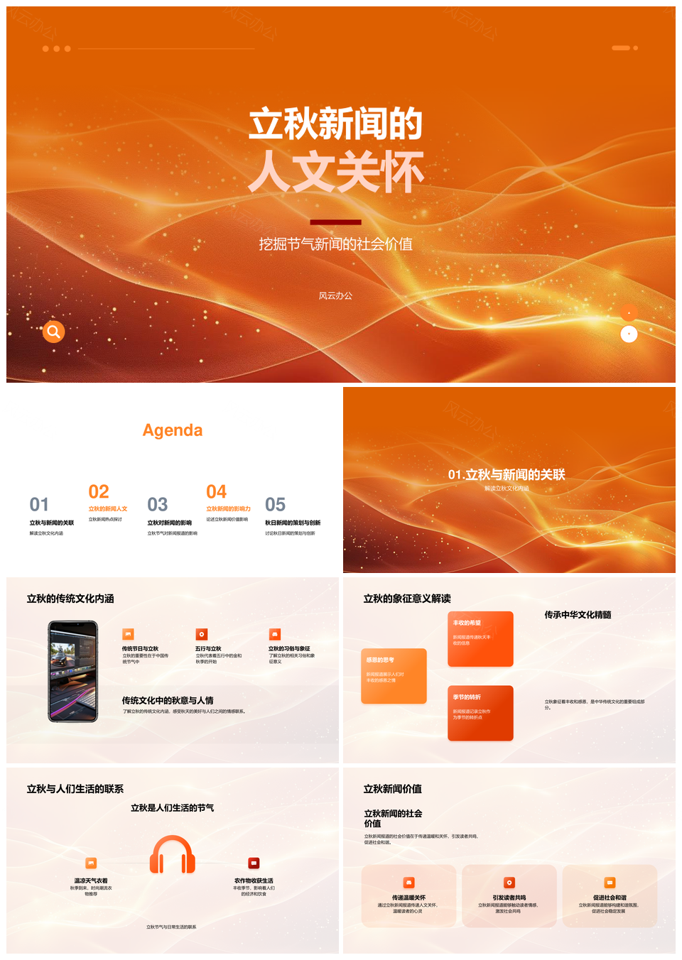 风云办公提供的立秋新闻选题点燃人文关怀社会价值PPT模板,下载格式为pptx,一共28页,作品中文字及图均可以修改和编辑,图片更改请在作品中右键图片并更换,文字修改请直接点击文字进行修改。