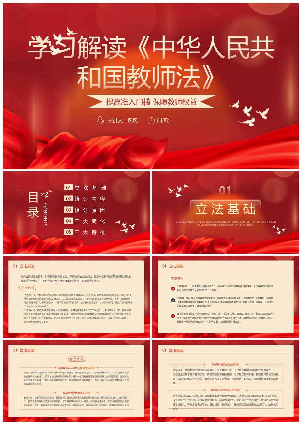 风云办公提供的红色党政风党建党课教师法培训课件,下载格式为pptx,一共30页,作品中文字及图均可以修改和编辑,图片更改请在作品中右键图片并更换,文字修改请直接点击文字进行修改。