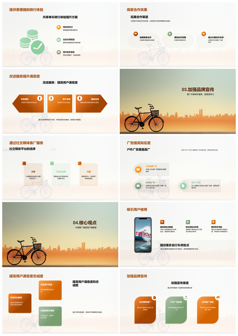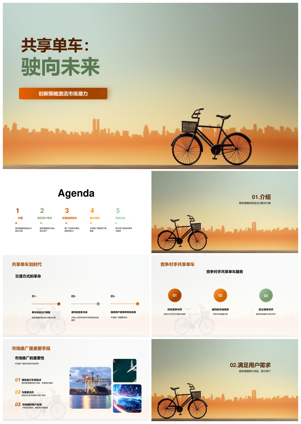 风云办公提供的共享单车市场推广策略与营销活动策划PPT模板,下载格式为pptx,一共22页,作品中文字及图均可以修改和编辑,图片更改请在作品中右键图片并更换,文字修改请直接点击文字进行修改。