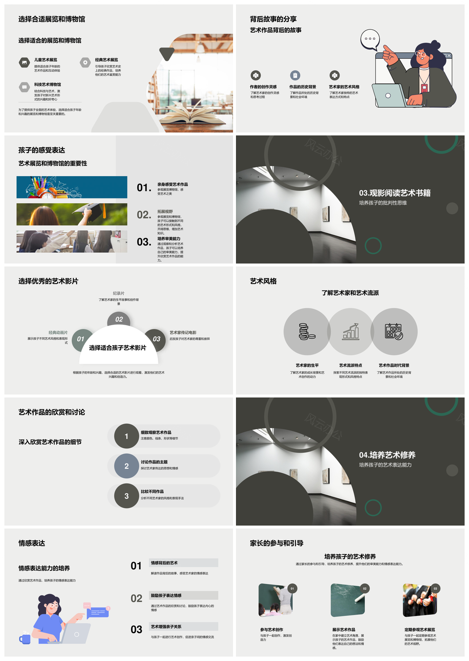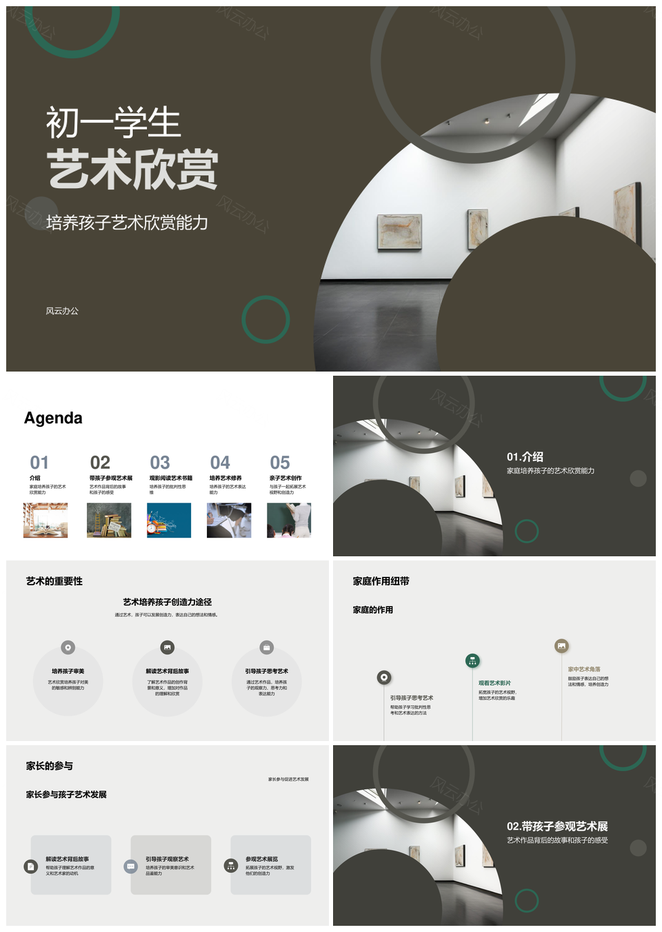 风云办公提供的家庭参与培养初一学生艺术欣赏展览PPT模板,下载格式为pptx,一共23页,作品中文字及图均可以修改和编辑,图片更改请在作品中右键图片并更换,文字修改请直接点击文字进行修改。
